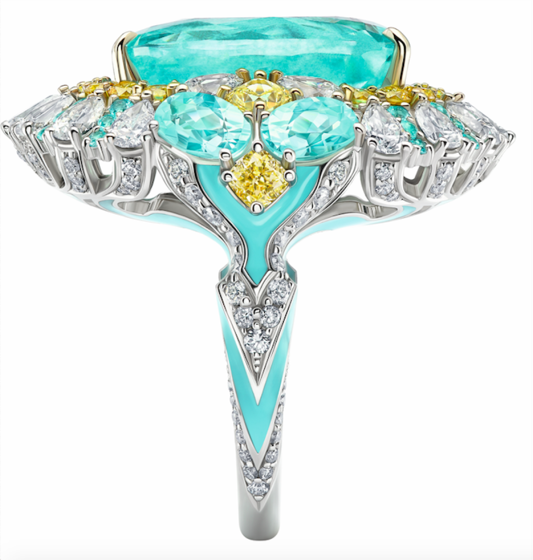 Салют для одного зрителя: кольцо с овальным турмалином параиба из Мозамбика весом в 12,94 карата, эмалью цвета морской волны, желтыми и бесцветными бриллиантами существует в единственном экземпляре.