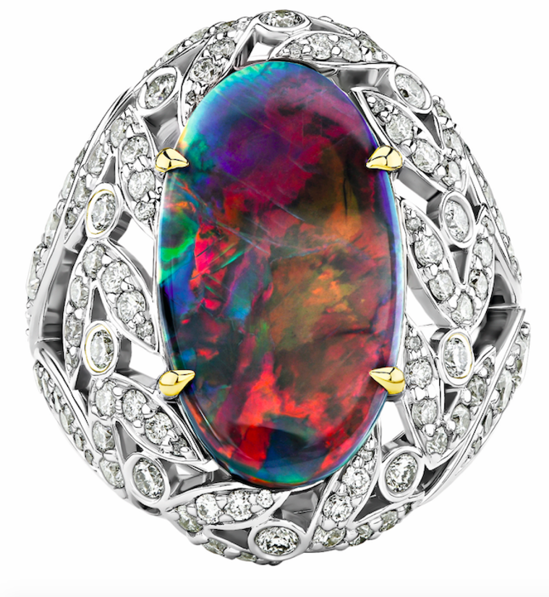 Прицесса Уэльская носила в такой оправе фамильные синие сапфиры и циклопические бриллианты. Но переливчатый черный опал из страны Содружества — еще более имперский выбор! Эти камни (точнее, минералоиды: у опалов нет кристаллической решетки, зато высокое содержание воды) добывают в Южной Австралии, где их десятки миллионов лет назад сформировало внутреннее море континента. Танзаниты и параиба, подвиньтесь: ювелиры коронуют опал как главный фэшн-камень 2022-го.