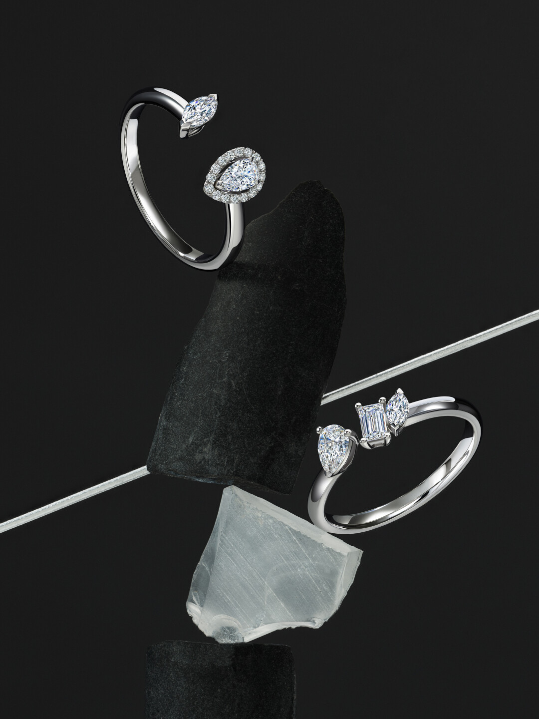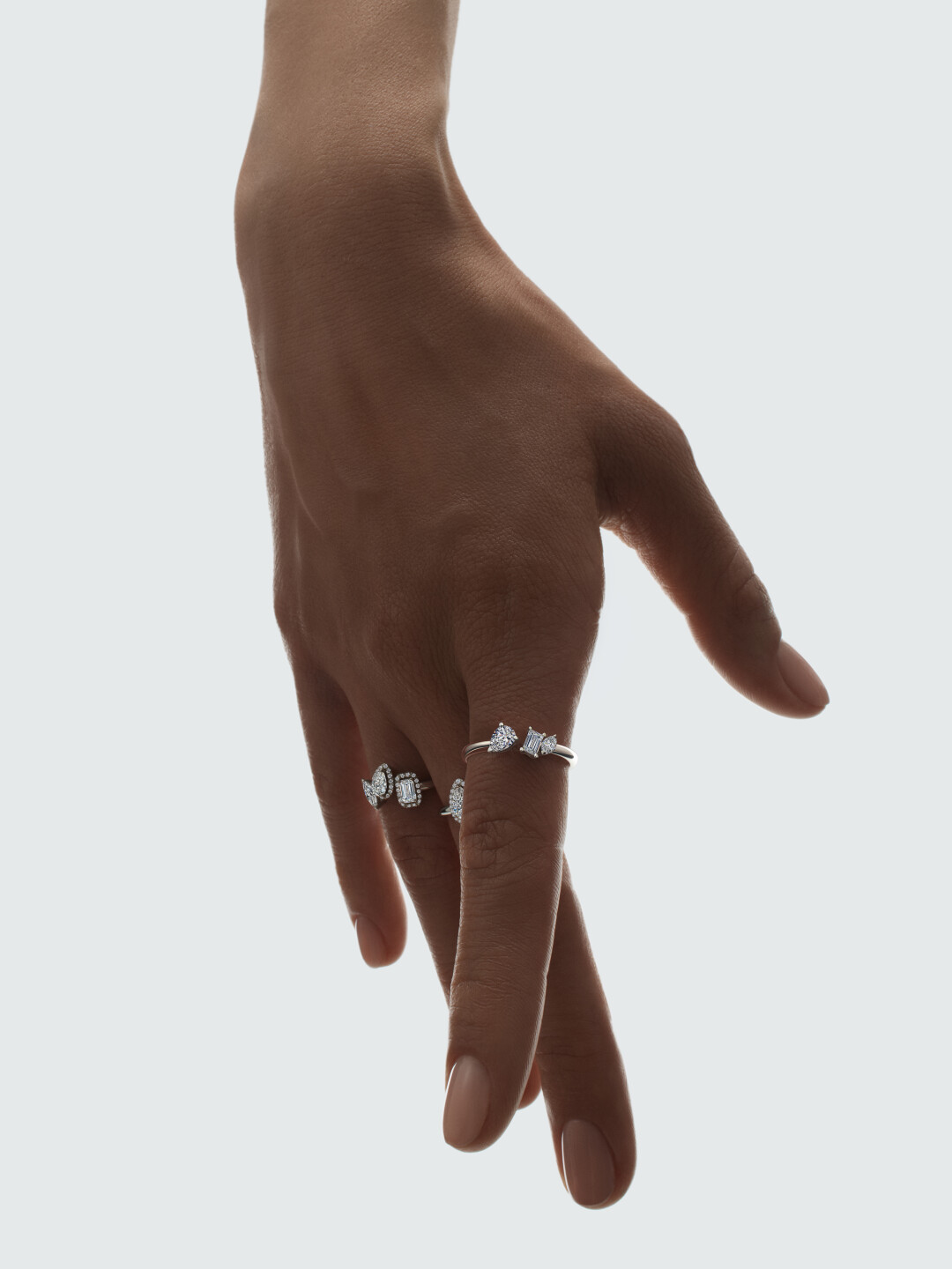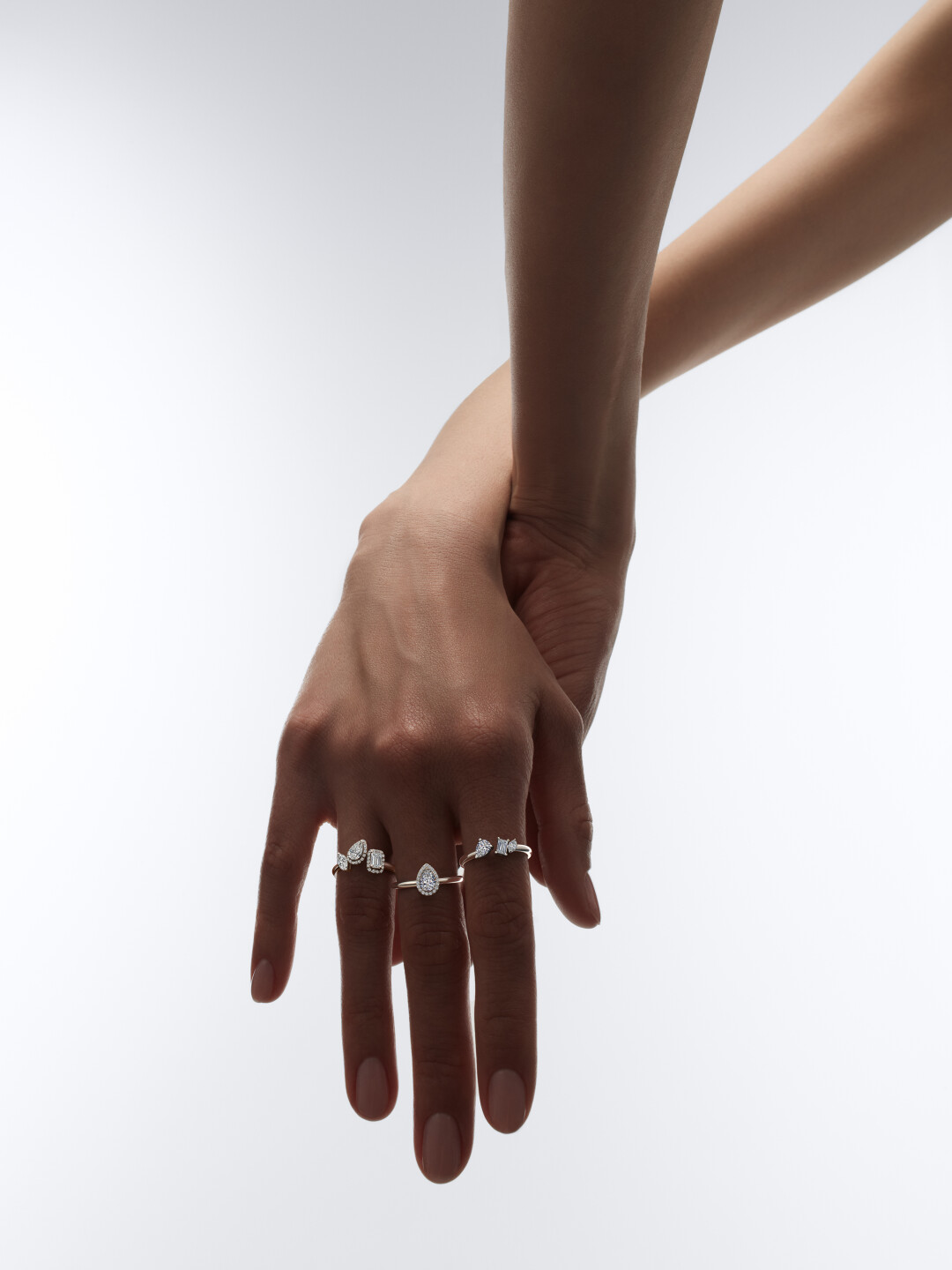 Абсолютные хиты коллекции: кольца-солитеры или гало (подойдут к чему угодно, фэшн-амплитуда от мермейдкора до худи), асимметричные разомкнутые кольца toi & moi (надеваем с хрустящей белой мужской сорочкой) и моно серьга с колеблющимся бриллиантом на длинной цепи (носим со сложносочиненным топом на тонких бретелях). Материалы – белые бриллианты и белое золото, фирменные огранки ALROSA: «маркиз», «груша», «изумруд» и «круг» и по отдельности выглядели эффектно, а сложившись в единое украшение смотрятся еще и наредкость нетривиально.