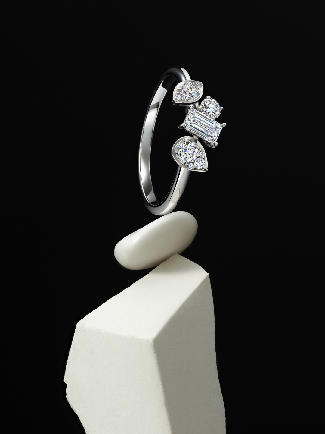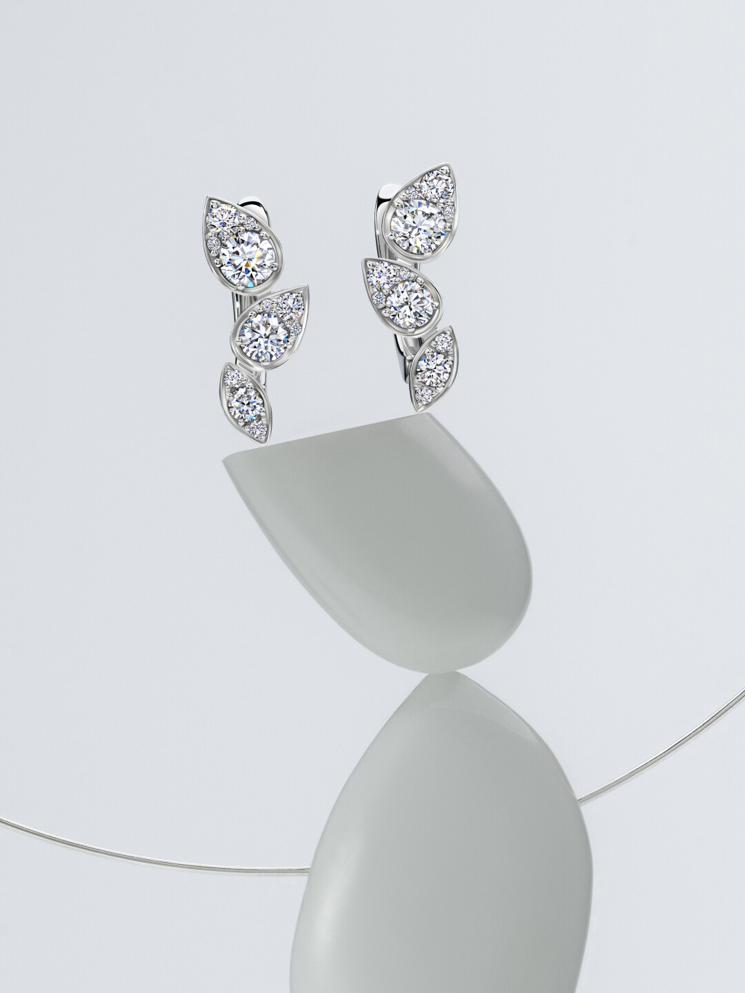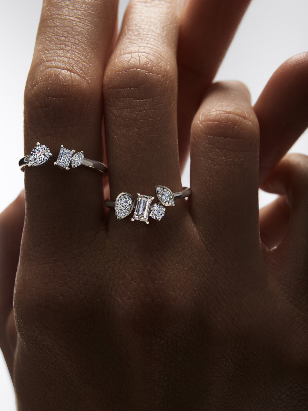 Абсолютные хиты коллекции: кольца-солитеры или гало (подойдут к чему угодно, фэшн-амплитуда от мермейдкора до худи), асимметричные разомкнутые кольца toi & moi (надеваем с хрустящей белой мужской сорочкой) и моно серьга с колеблющимся бриллиантом на длинной цепи (носим со сложносочиненным топом на тонких бретелях). Материалы – белые бриллианты и белое золото, фирменные огранки ALROSA: «маркиз», «груша», «изумруд» и «круг» и по отдельности выглядели эффектно, а сложившись в единое украшение смотрятся еще и наредкость нетривиально.