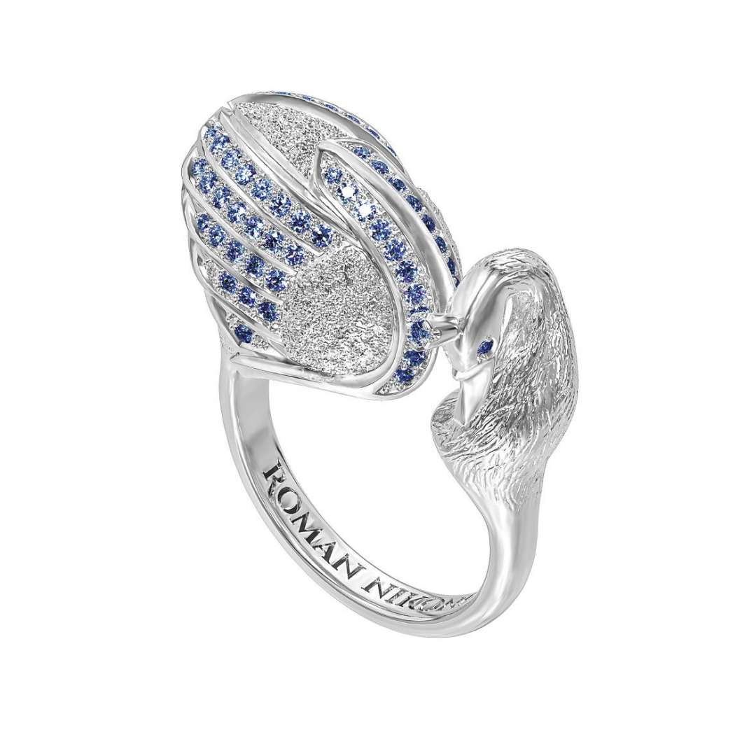 «Говорят, колечко есть, что не можно глаз отвесть!» —это точно про «Царевну-лебедь» петербургского ювелирного дома Roman Nikonov: перышки на белом золоте прорисованы вручную и, словно каплями воды, покрыты сапфирами.