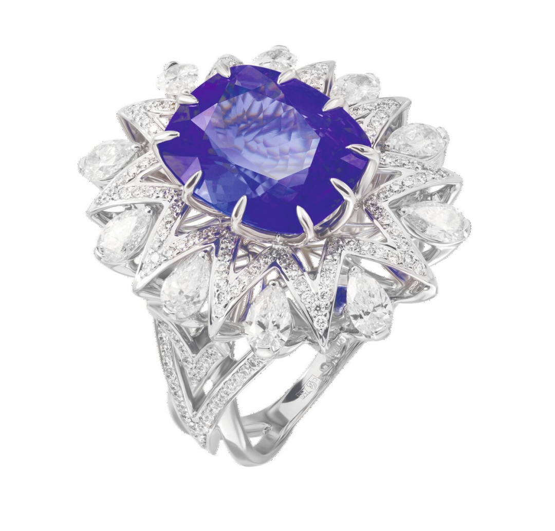Кольцо Maxim Demidov «Вечное сияние» (чистого танзанита весом почти в пять карат) — воистину выдающееся. Не только размерами самоцвета, но и окладом из белого золота и двухсот бриллиантов разных огранок.