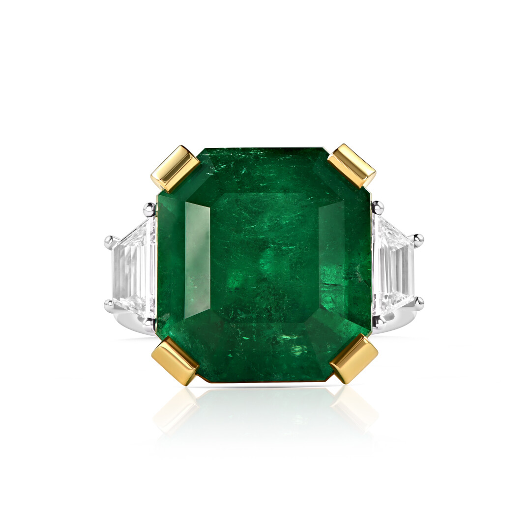 Когда ювелирам нечего скрывать, они делают ступенчатую огранку — при ней камень виден насквозь, с мельчайшими включениями, трещинками и переливами цвета. Или (если невероятно повезет) почти без них, как огромный чистый изумруд из колумбийских Анд весом в 12,56 карата плюс два прозрачных бриллианта в 0,83 карата. Для центрального камня в Parure Atelier выбрали форму октагона, а для боковых — трапецию, одну из самых редких огранок. Всё ради максимальной транспарентности и невиданного сияния.