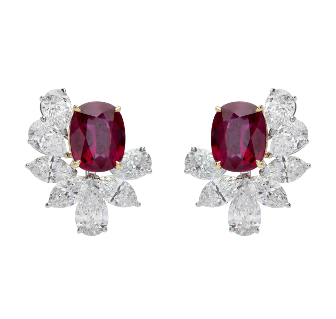 Каждый геммолог желает знать, где добыт рубин! Говорим «голубиная кровь» — и у специалистов хищно сверкают глаза. Хотя подманить на это словосочетание можно всех любителей алых камней. Потому что так называется самый редкий окрас рубинов родом с севера Мьянмы. Эталонный красный оттенок с легкой синевой имеют камни, добытые в шахтах горного региона Могоу. Оттуда и прилетели два рубина, ограненные ювелирами Mercury в «овалы» по 3,5 карата. В гнезде из семи белых бриллиантовых «груш» и «маркизов» их держат острые коготки крапанов из контрастного желтого золота.
