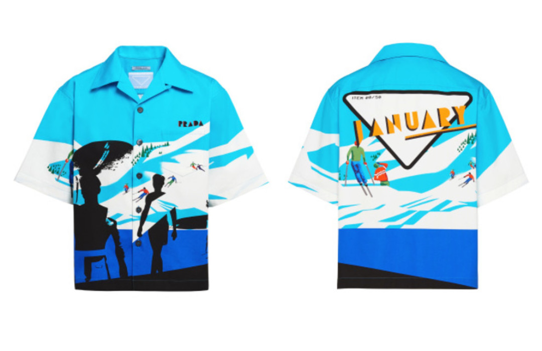 Спортивная рубашка из хлопкового поплина с оригинальным рисунком, на котором изображены несколько видов каникул: морские и горные пейзажи с лыжниками и персонажи в купальниках на ярко-синем фоне. Коллекция Time Capsule доступна в специальном разделе онлайн-магазина лейбла.