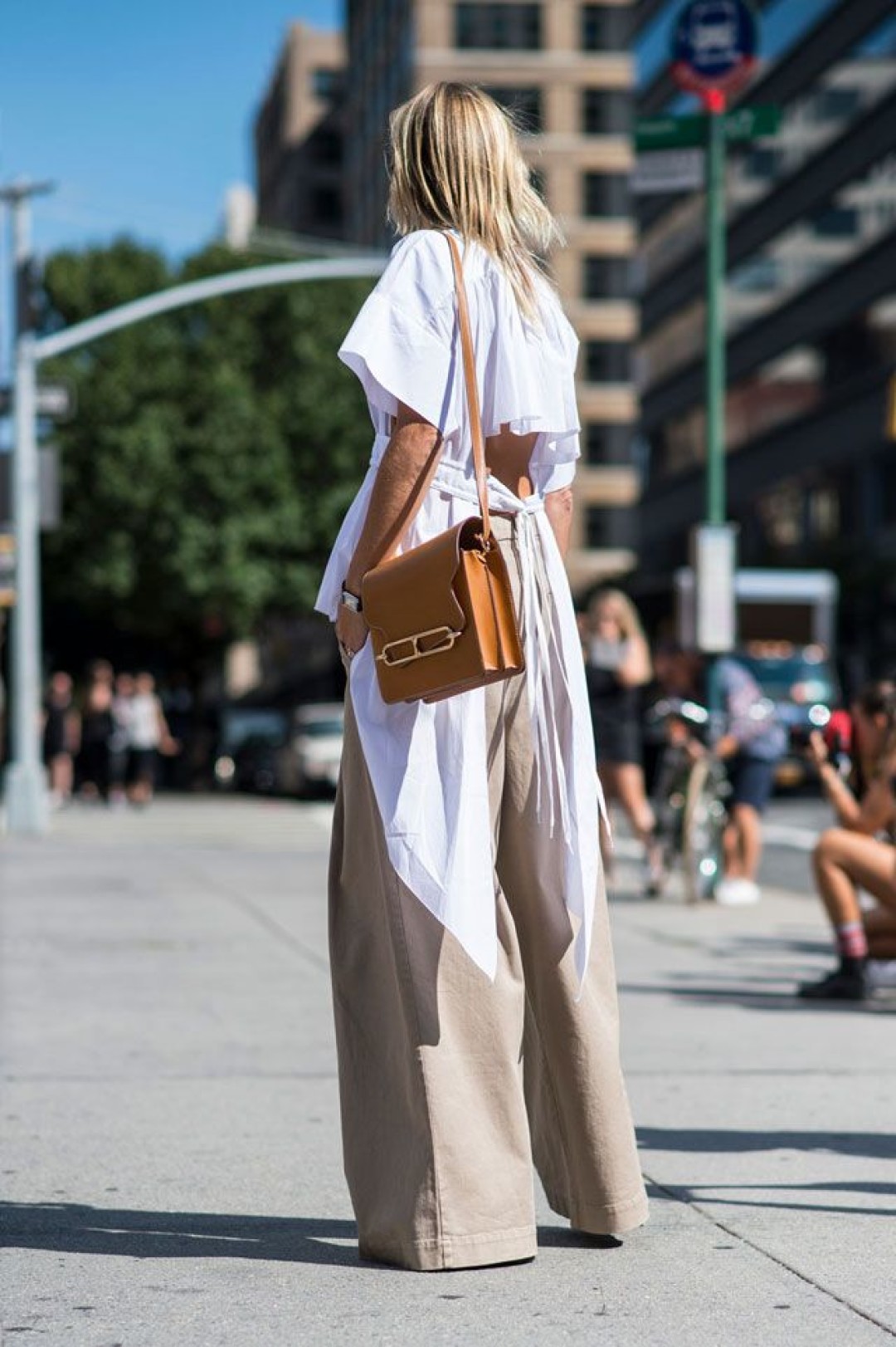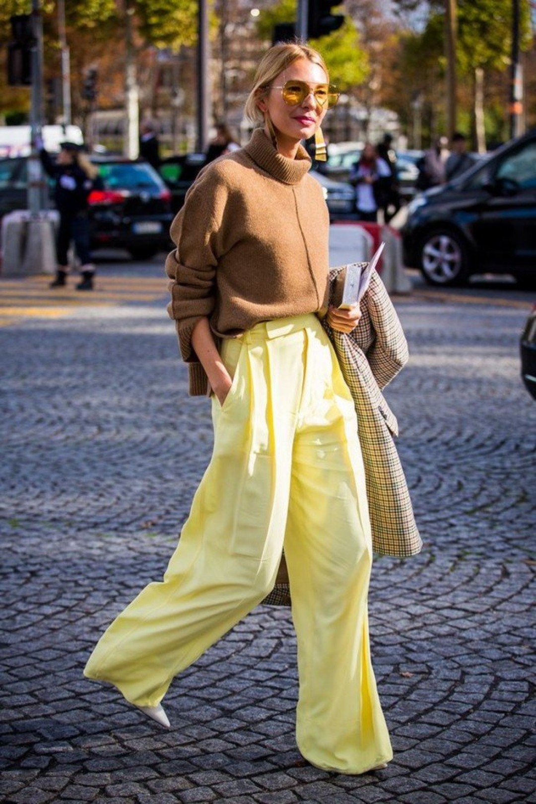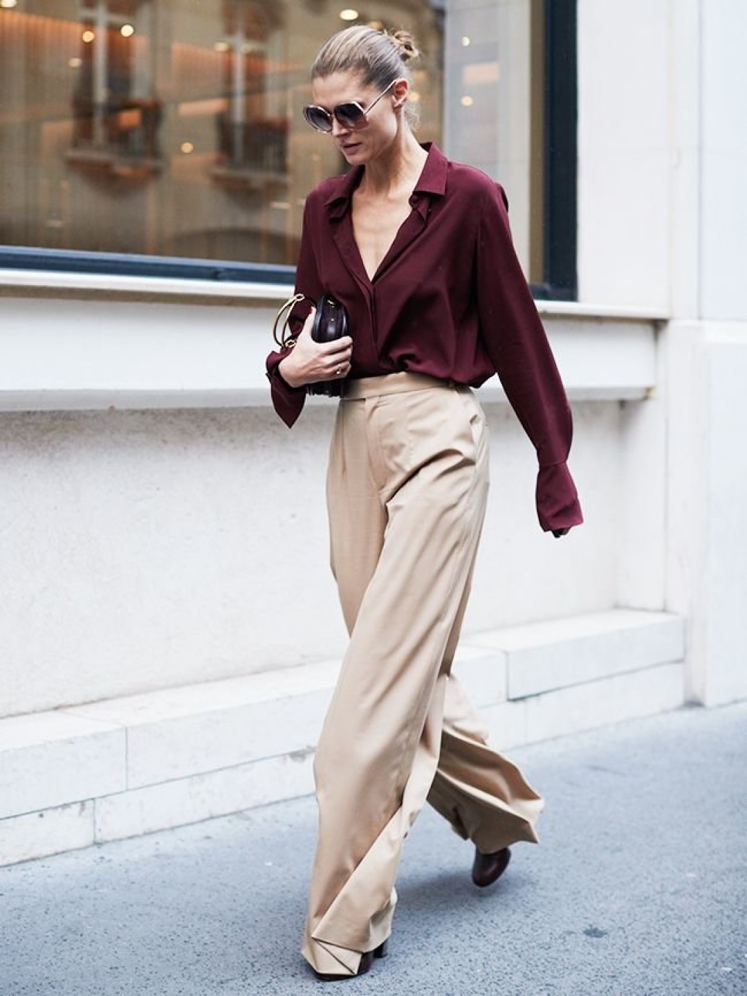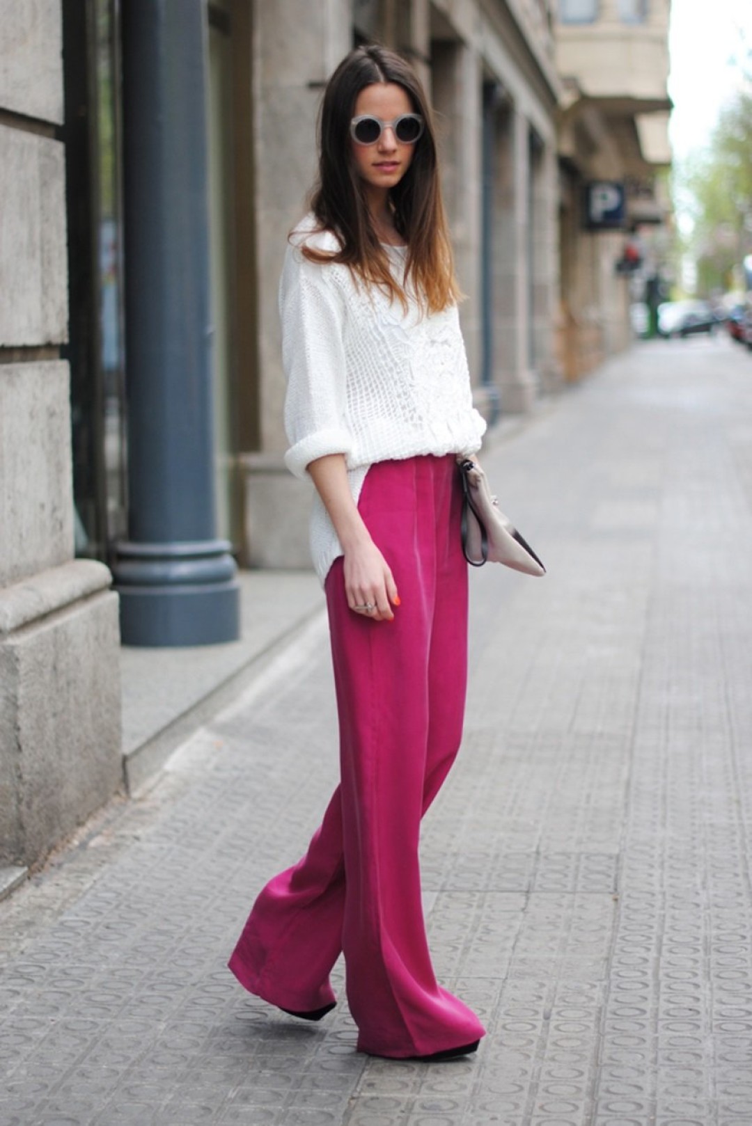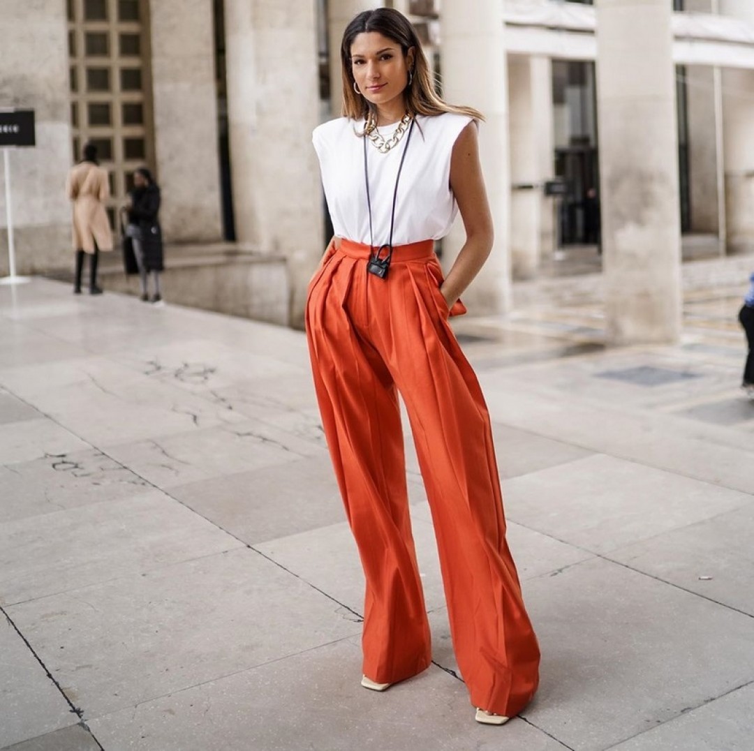 Отдаем предпочтение классическим палаццо, а также палаццо с защипами и стрелками. Сочетаем с объемными жакетами, рубашками в тон, либо с асимметричными топами, футболками с подплечниками. Больше вариантов в нашей подборке.