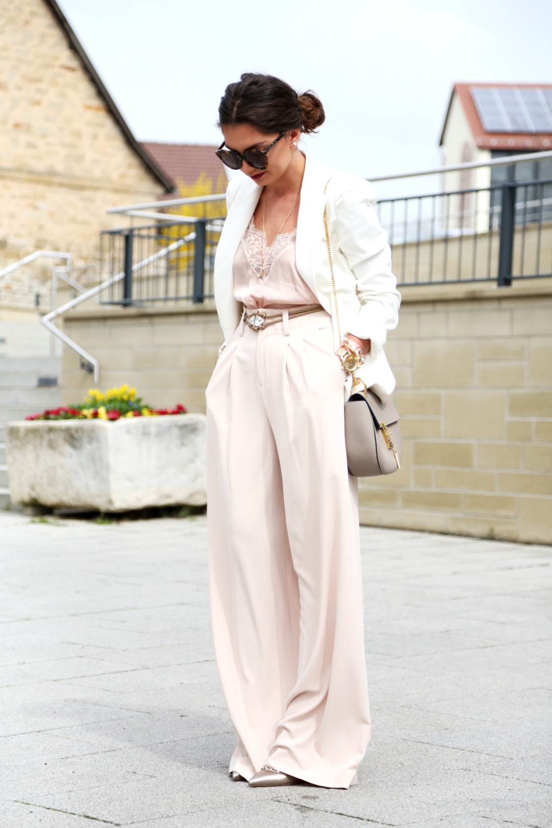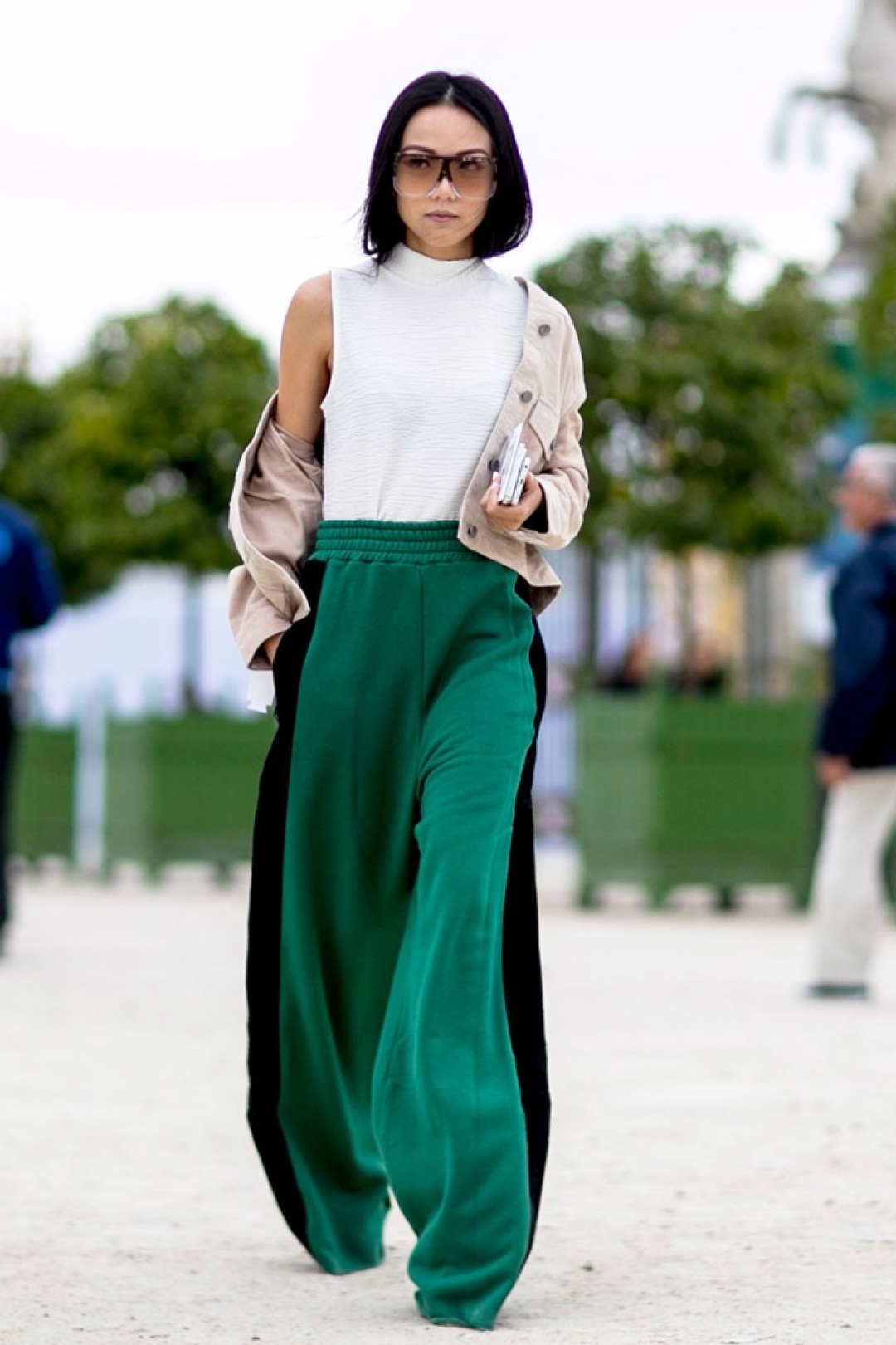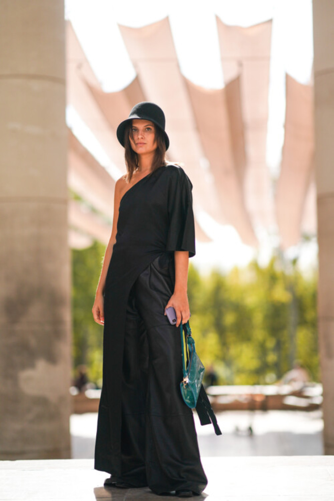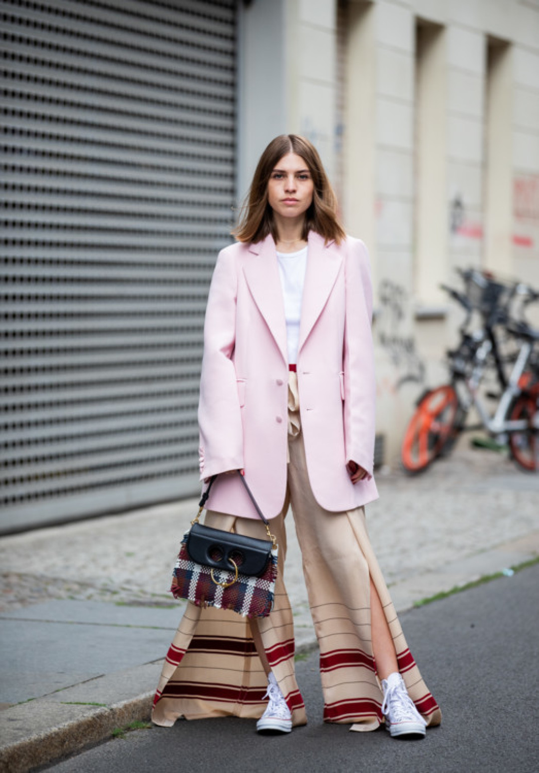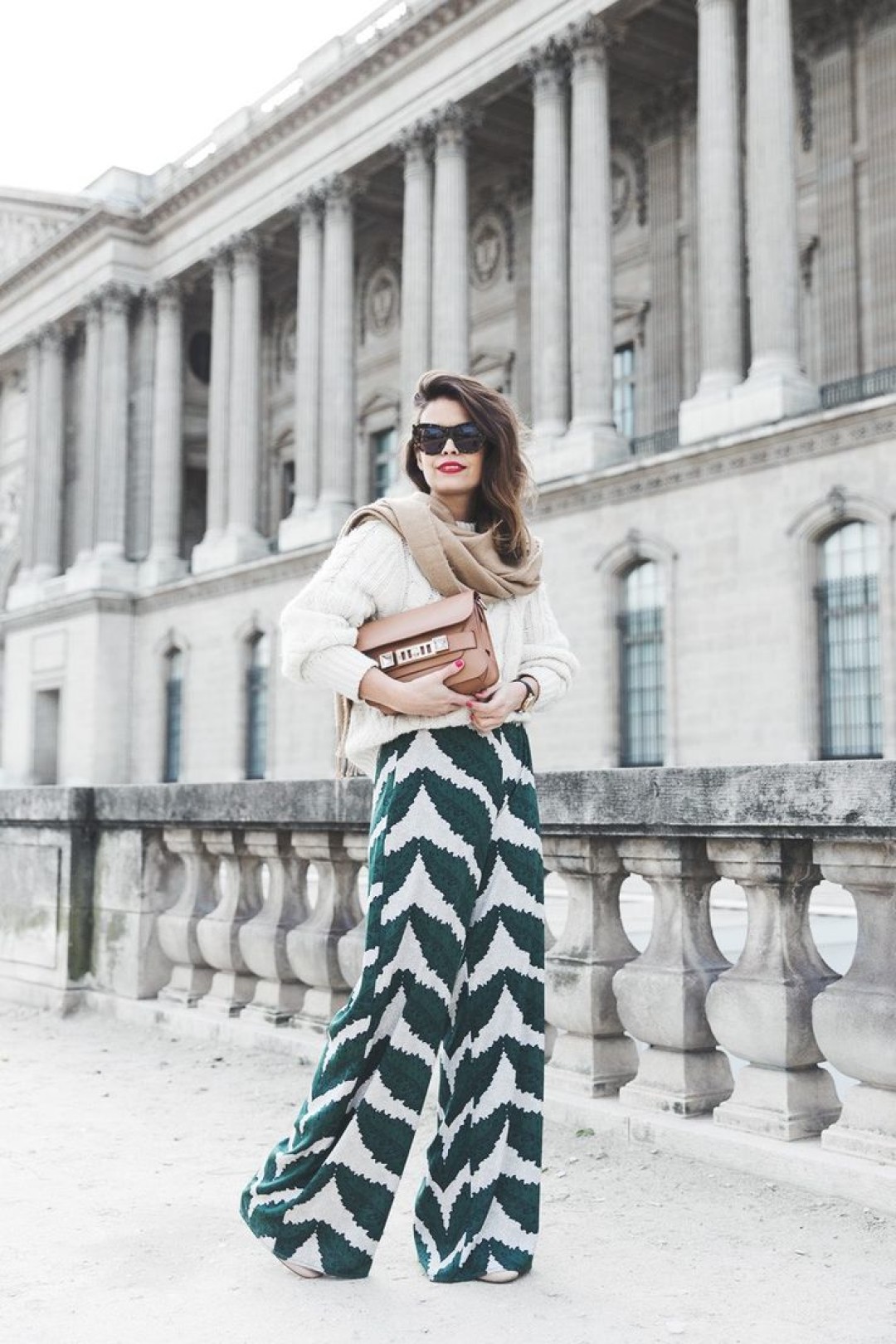 Отдаем предпочтение классическим палаццо, а также палаццо с защипами и стрелками. Сочетаем с объемными жакетами, рубашками в тон, либо с асимметричными топами, футболками с подплечниками. Больше вариантов в нашей подборке.