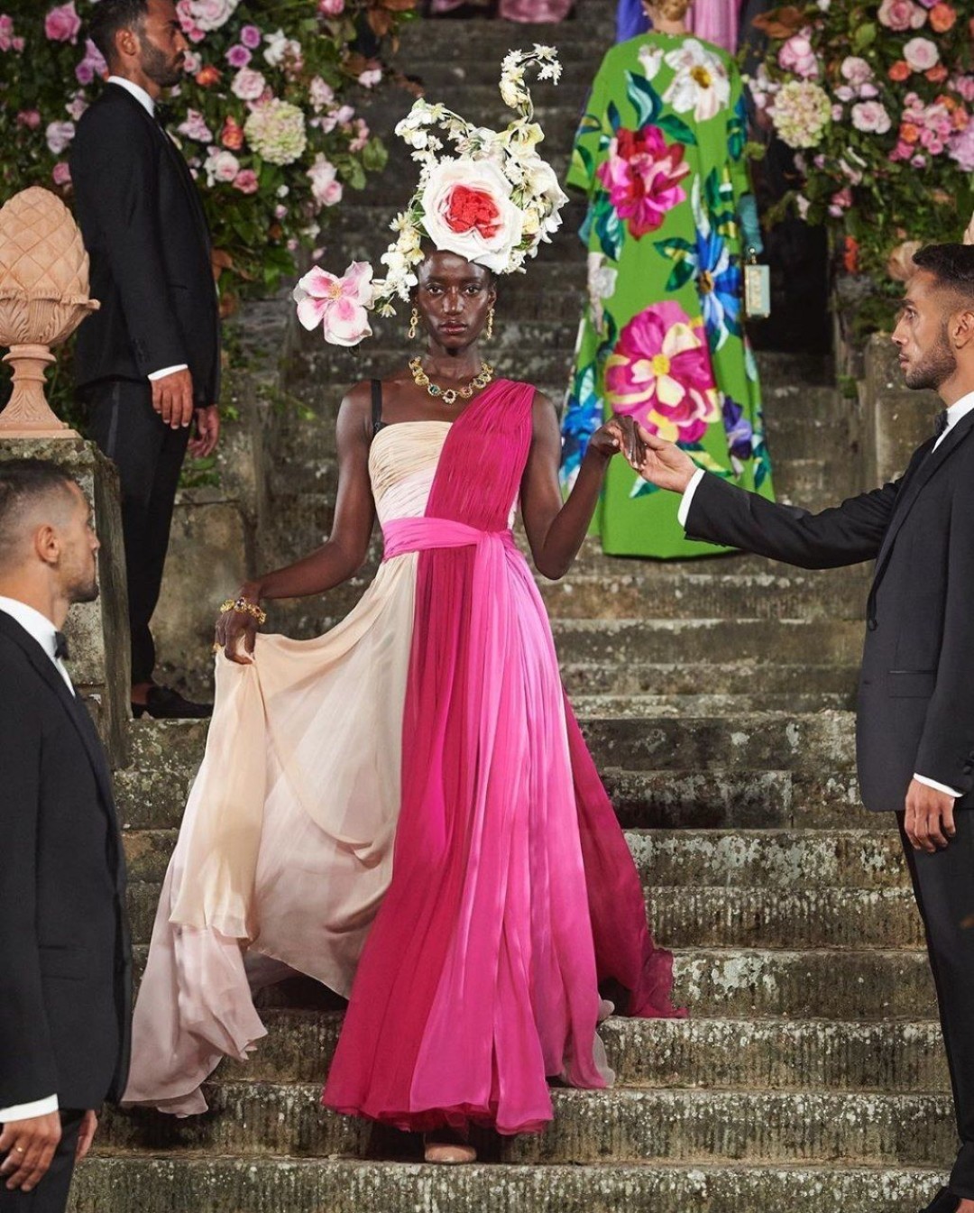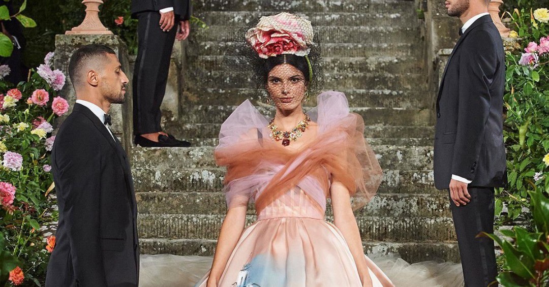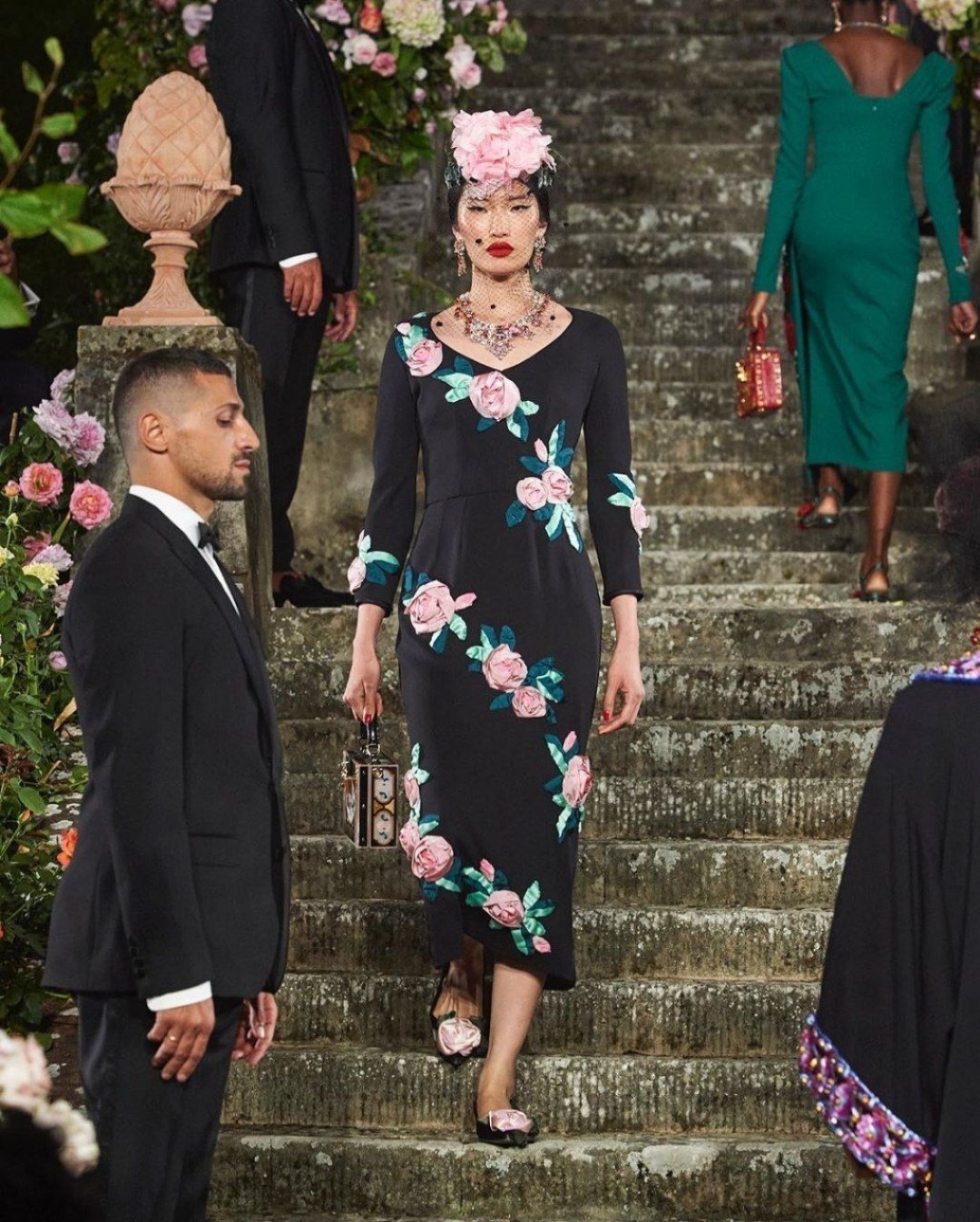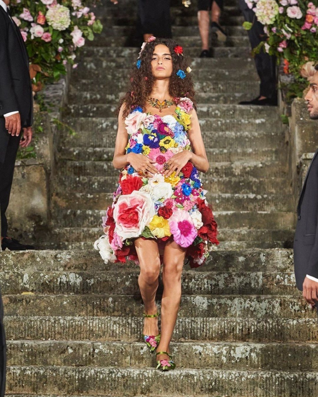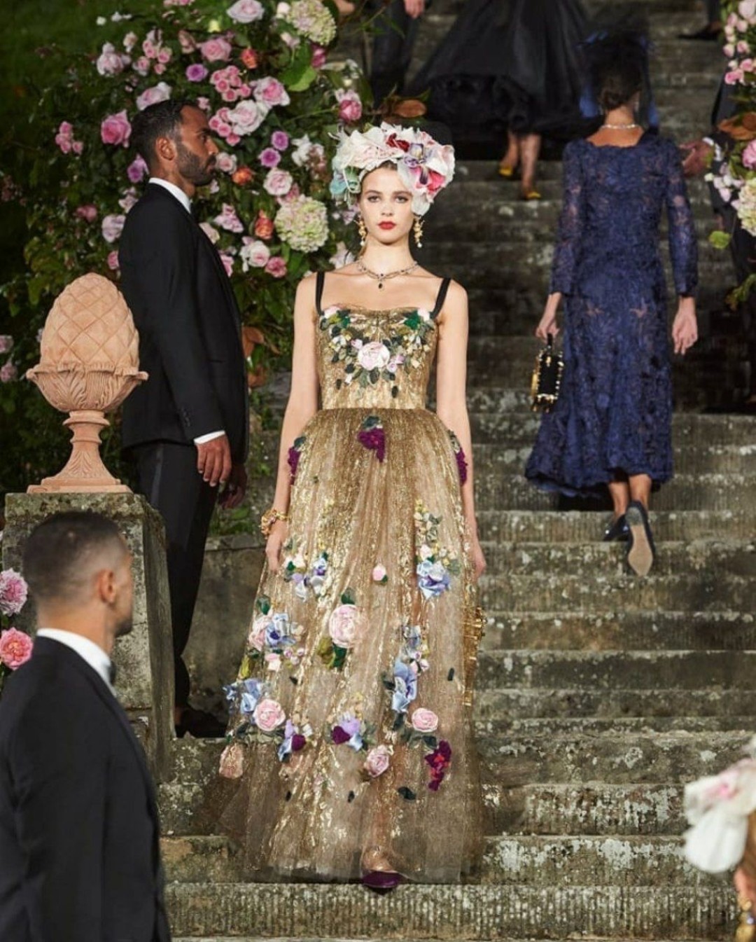 В Италии прошло одно из первых громких офлайн-событий в мире моды с начала пандемии — кутюрный показ Dolce&Gabbana Alta Moda. Показ проходил во флорентийскому саду Villa Bardini. Модели спускались по украшенной каменной лестнице в мини и макси платьях с цветочными принтами и искусственными бутонами, головные уборы также напоминали бутоны прекрасных цветов.
