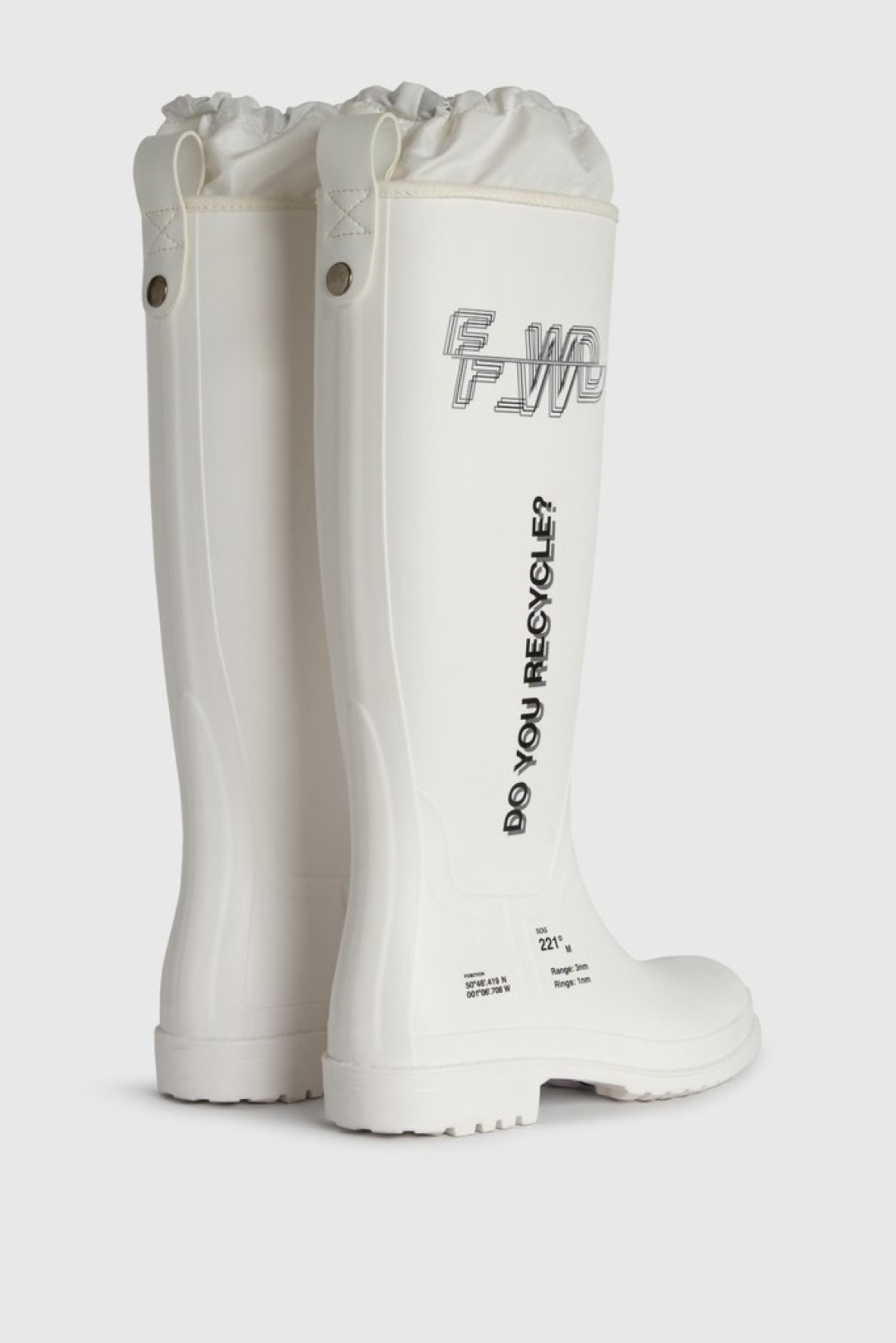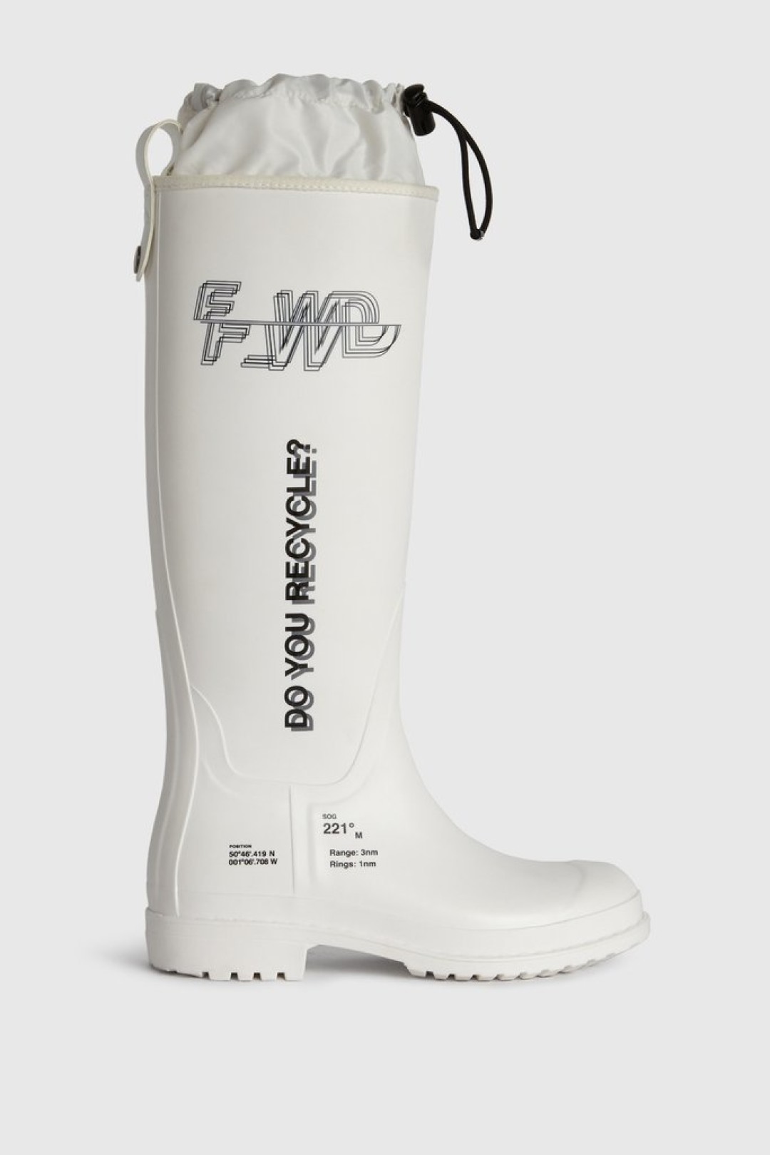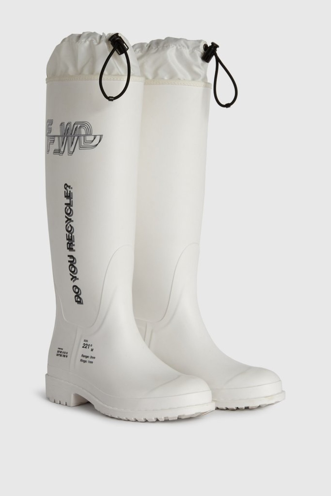 Ливни на выходных напомнили о необходимости поиска обуви для осенней влажной непогоды. Не забывая об экологической осознанности и любви к необычному дизайну, нашли белые высокие сапоги бренда F_WD, которые созданы из переработанной резины и океанического мусора. «Do You Recycle?» - мантра-напоминалка на голенище не даст забыть о приоритетах.