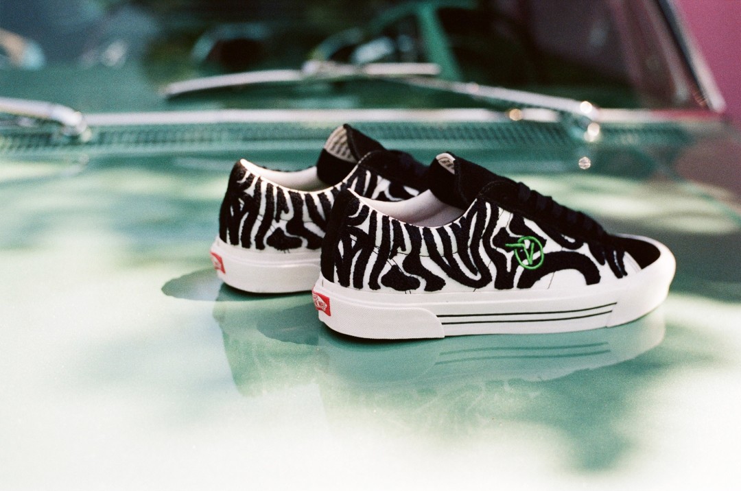 Кеды представлены в двух моделях: Old Skool с психоделическим узором, переливающимся желтым и голубым цветом, а также черно-белые Sid с разноцветными шнурками, контрастной строчкой и полупрозрачной зеленой подошвой.