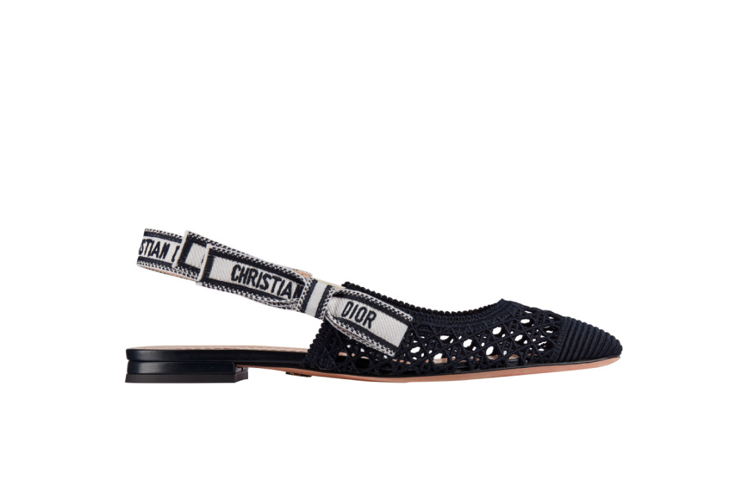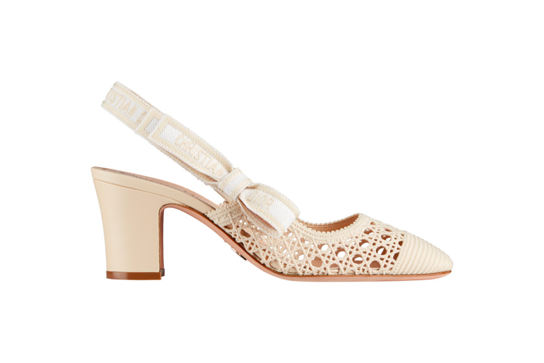 Модный дом Dior представил туфли-лодочки Dior & Moi с открытой пяткой. Передняя часть выполнена из текстиля с фирменным ажурным плетением Cannage, а щиколотку подчеркивает лента с повторяющимся названием французского бренда.