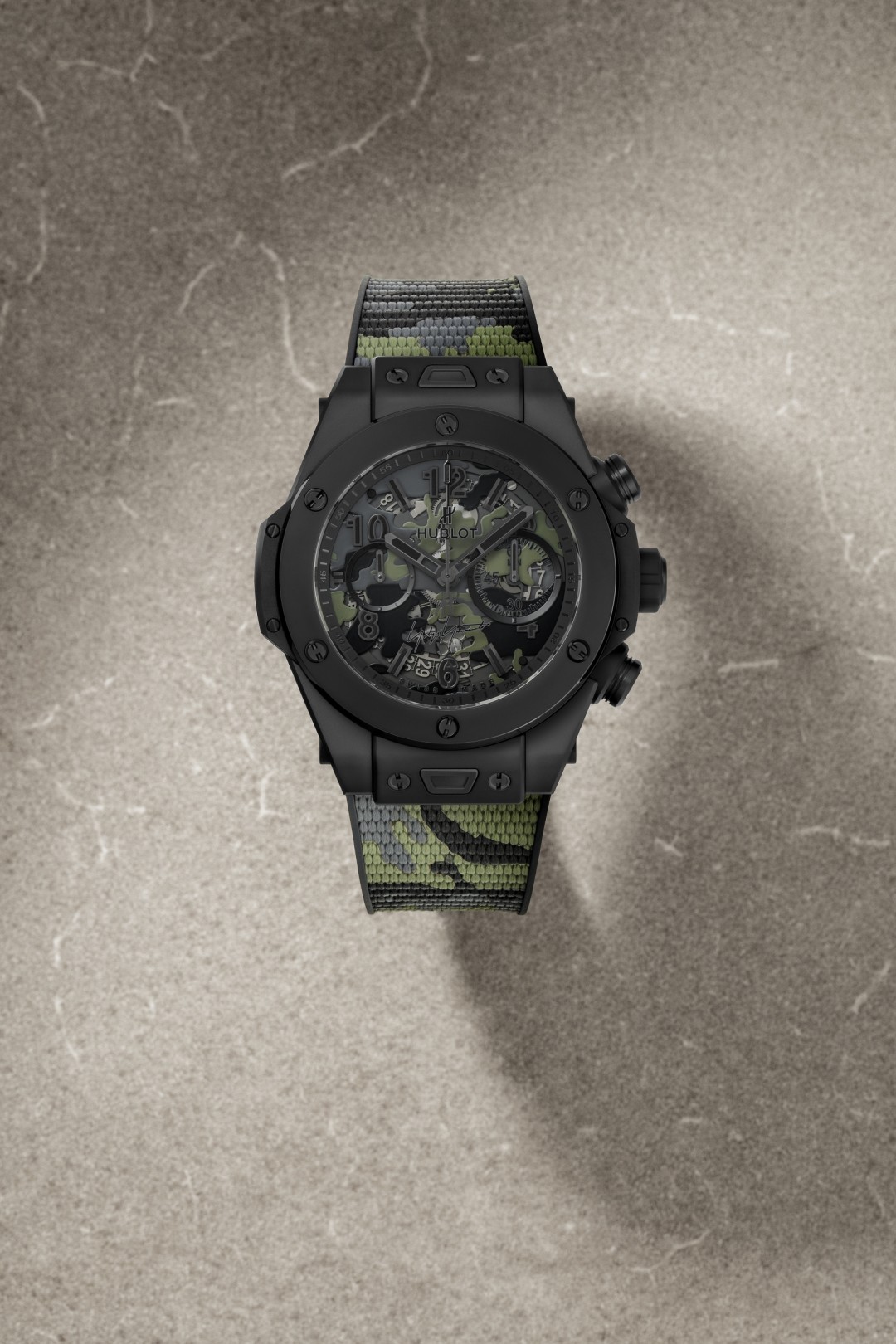 Японский дизайнер Йоджи Ямамото разработал с Hublot модель в корпусе из матовой керамики (всего 200 экземпляров!). Накладные детали на сапфировом циферблате образуют биоморфный узор, а армейский мотив на ремешке выполнен в технологии вулканизации — это ноу-хау швейцарской мануфактуры.
