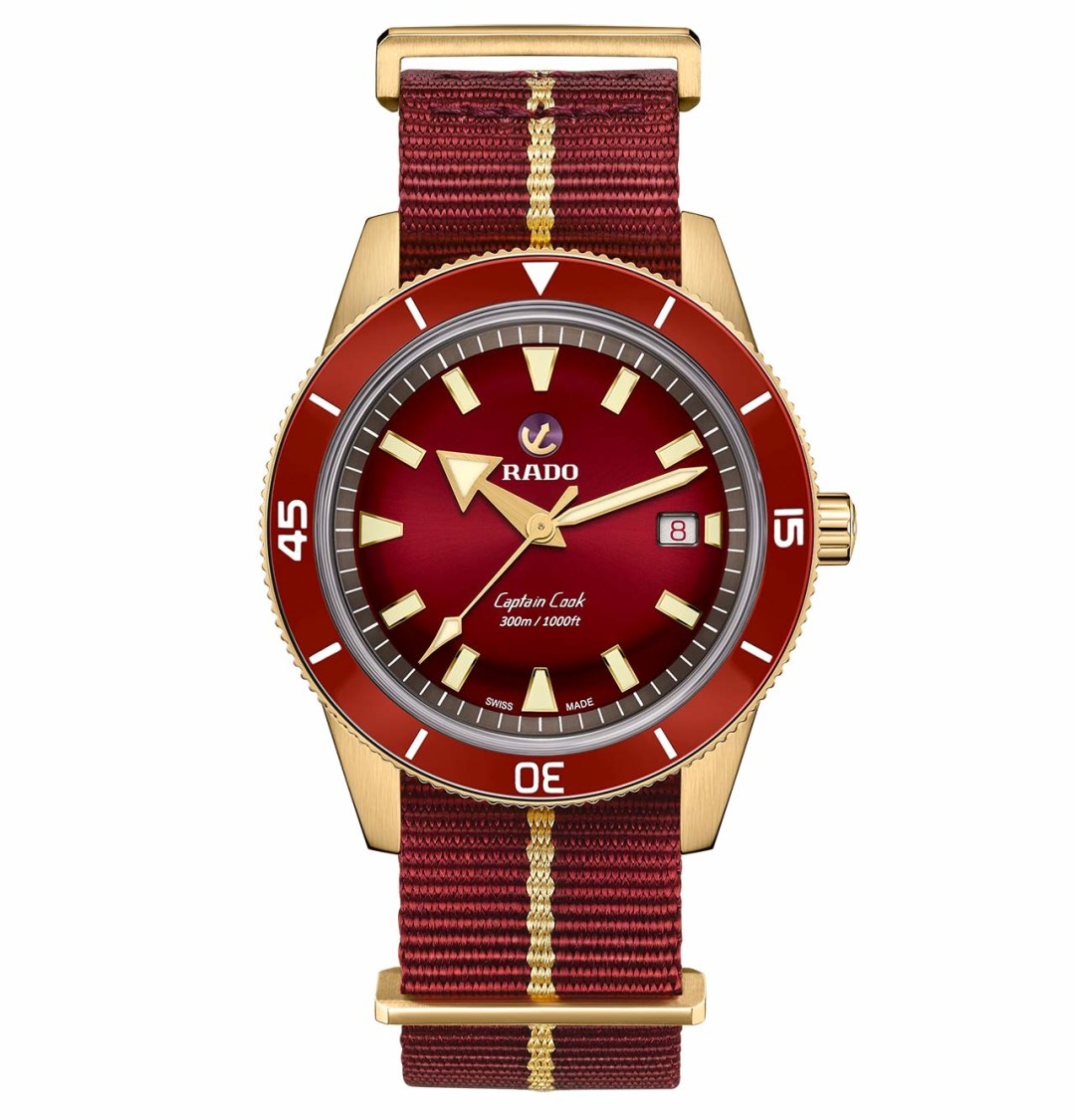 Микс бронзы и высокотехнологичной керамики сложного бургундского оттенка, забавная ретро-стрелка, как на модели Captain Cook 1962 года, натовский ремешок, выносливость в 80 часов без подзавода и 300 метров под водой — «сын маминой подруги» среди часов!