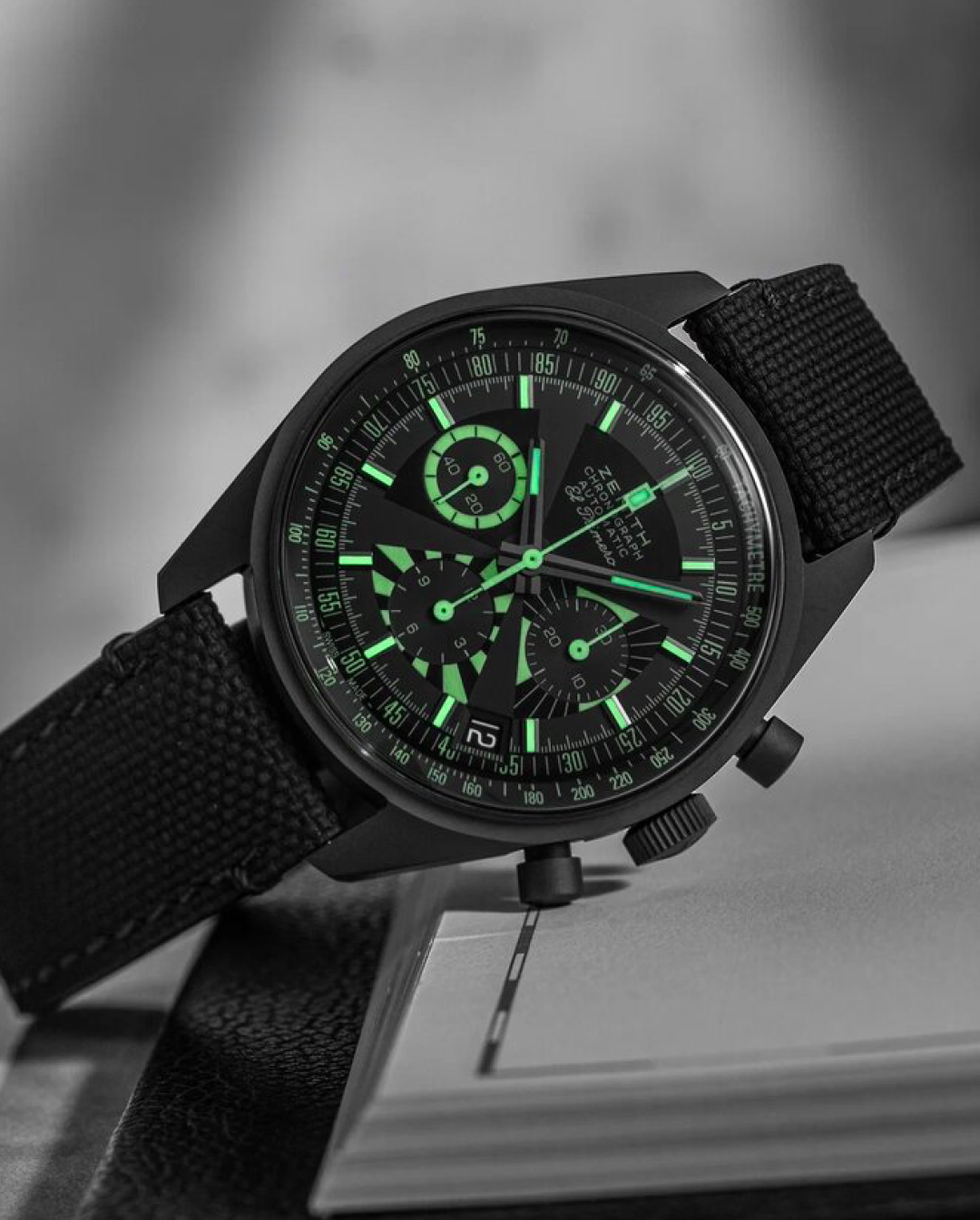 Zenith Chronomaster Revival «Poker Chip» созданы в сотрудничестве с сингапурским часовым журналом SJX Watche. Целью двух партнеров было воспроизвести ключевые элементы G383. Так появился черно-белый дизайн «Poker Chip», основанный на оттенках серого цвета и покрытия Super-Luminova. Больше светящегося покрытия можно найти на часовых метках, шкалах хронографа, а также на радиальных узорах вокруг каждого регистра.