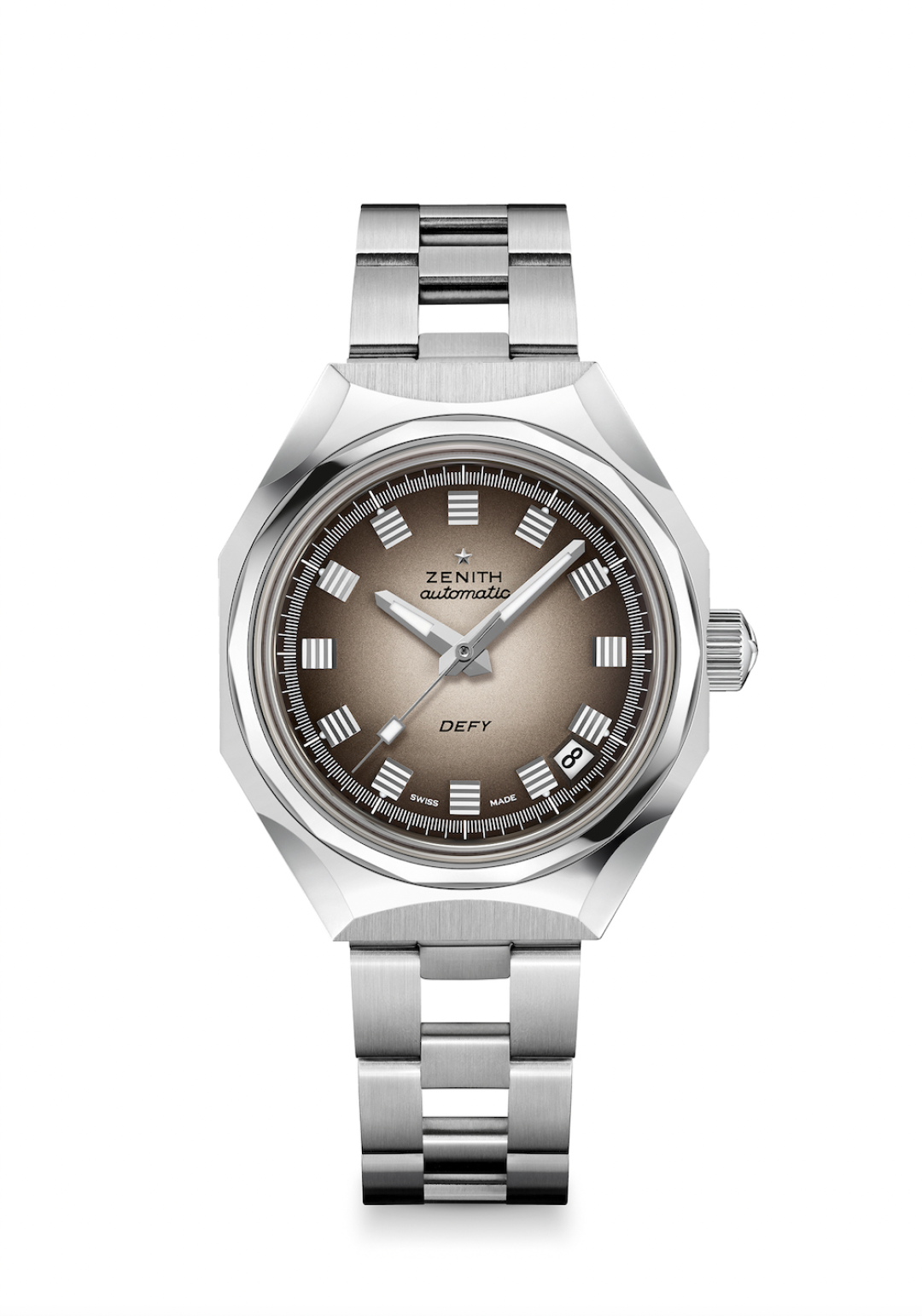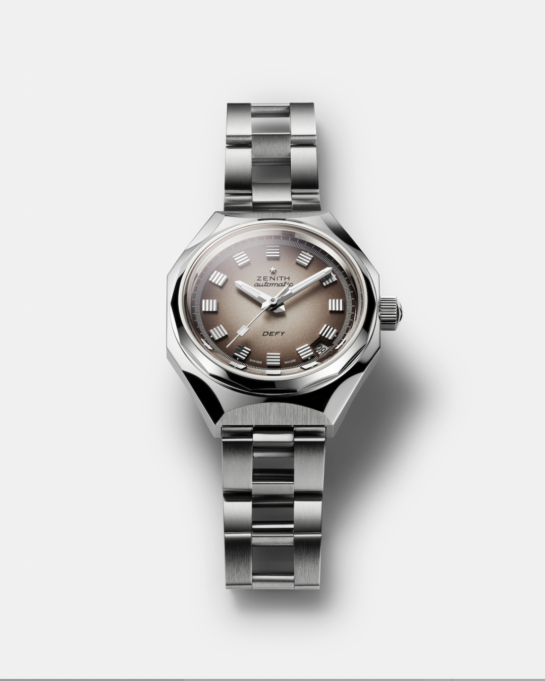 У DEFY Revival A3642 циферблат теплого серого цвета с эффектом градиента, темнеющим к краям, и квадратные часовые метки с родиевым напылением – символ вечного движения. Широкие стрелки в форме «мечей» и секундная стрелка в форме «весла» заполнены люминофором, оттенок которого использовался в оригинальной модели. Циферблат снабжен функцией индикации даты в положении «4 часа 30 минут».