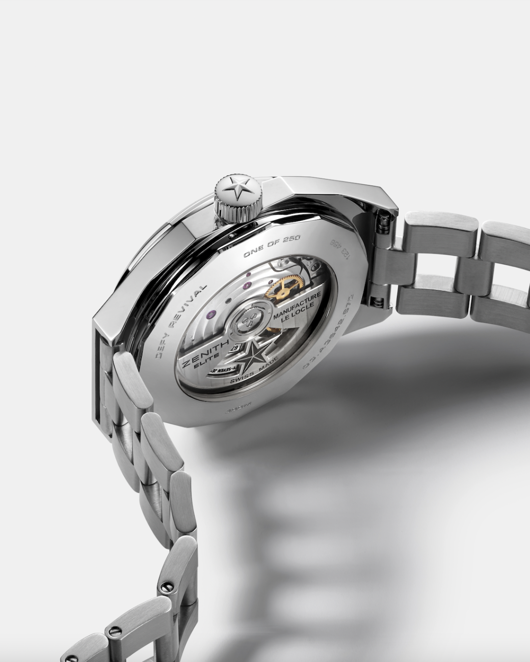 На задней крышке восьмиугольного корпуса часов прозрачное сапфировое стекло, через которое виден автоматический мануфактурный механизм Elite 670. Это главное отличие DEFY Revival A3642 от оригинальной модели. Механизм часов дополнен автоматическим подзаводом, который обеспечивает запас хода около 60 часов. Возрожденная модель так же, как и икона, обладает водонепроницаемостью 300 М.