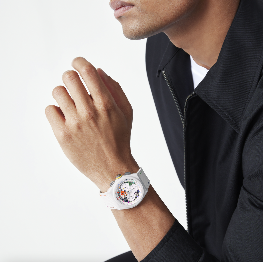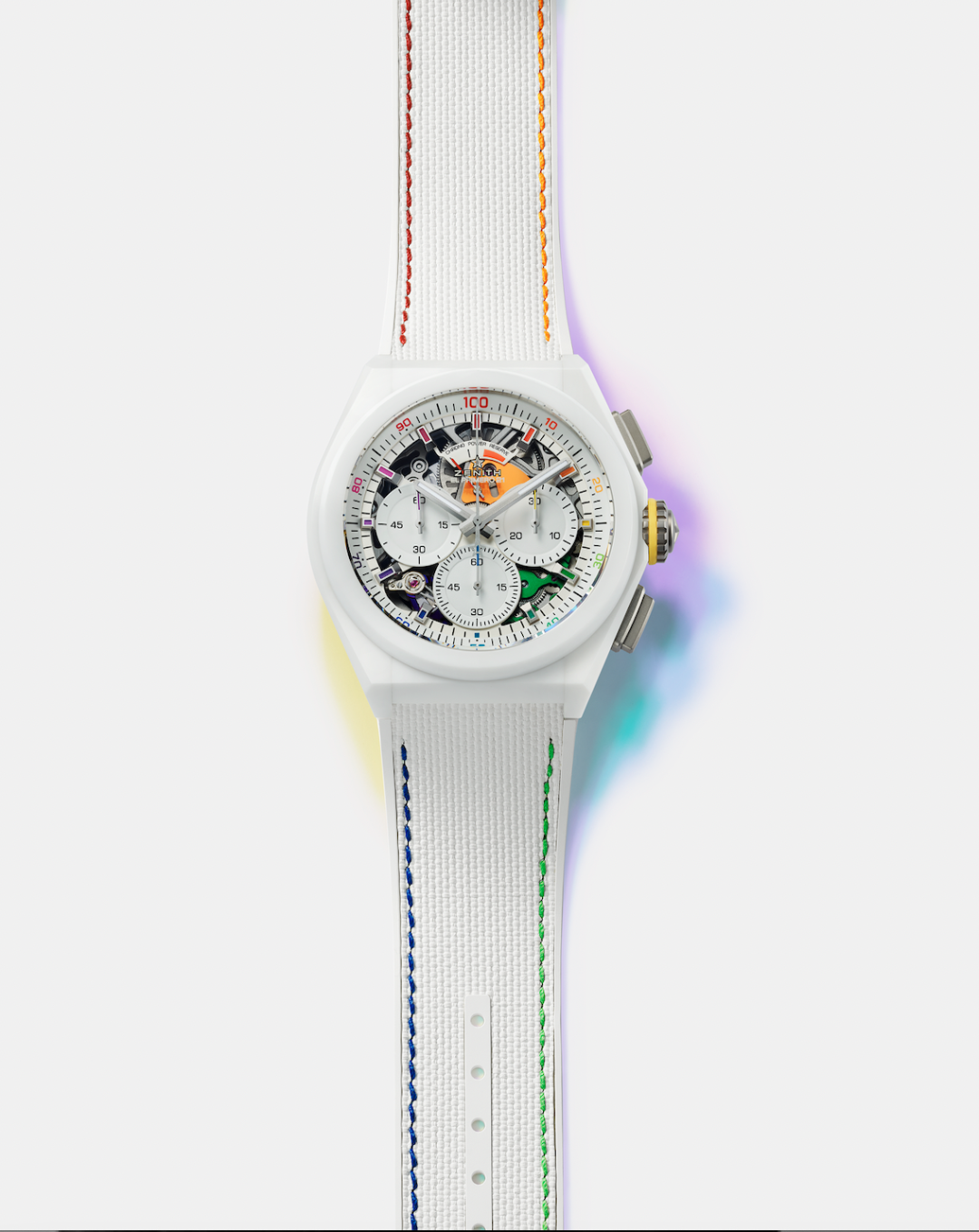 Мануфактура Zenith продолжает работать с цветом. Это подтверждает новинка часового бренда — модель Defy 21 Chroma. Для нее был выбран белый оттенок, который представляет собой сочетание всех цветов в видимом спектре света. Так корпус часов выполнен из белой керамики с матовой отделкой, чтобы создать контраст и подчеркнуть цвета внутри.
