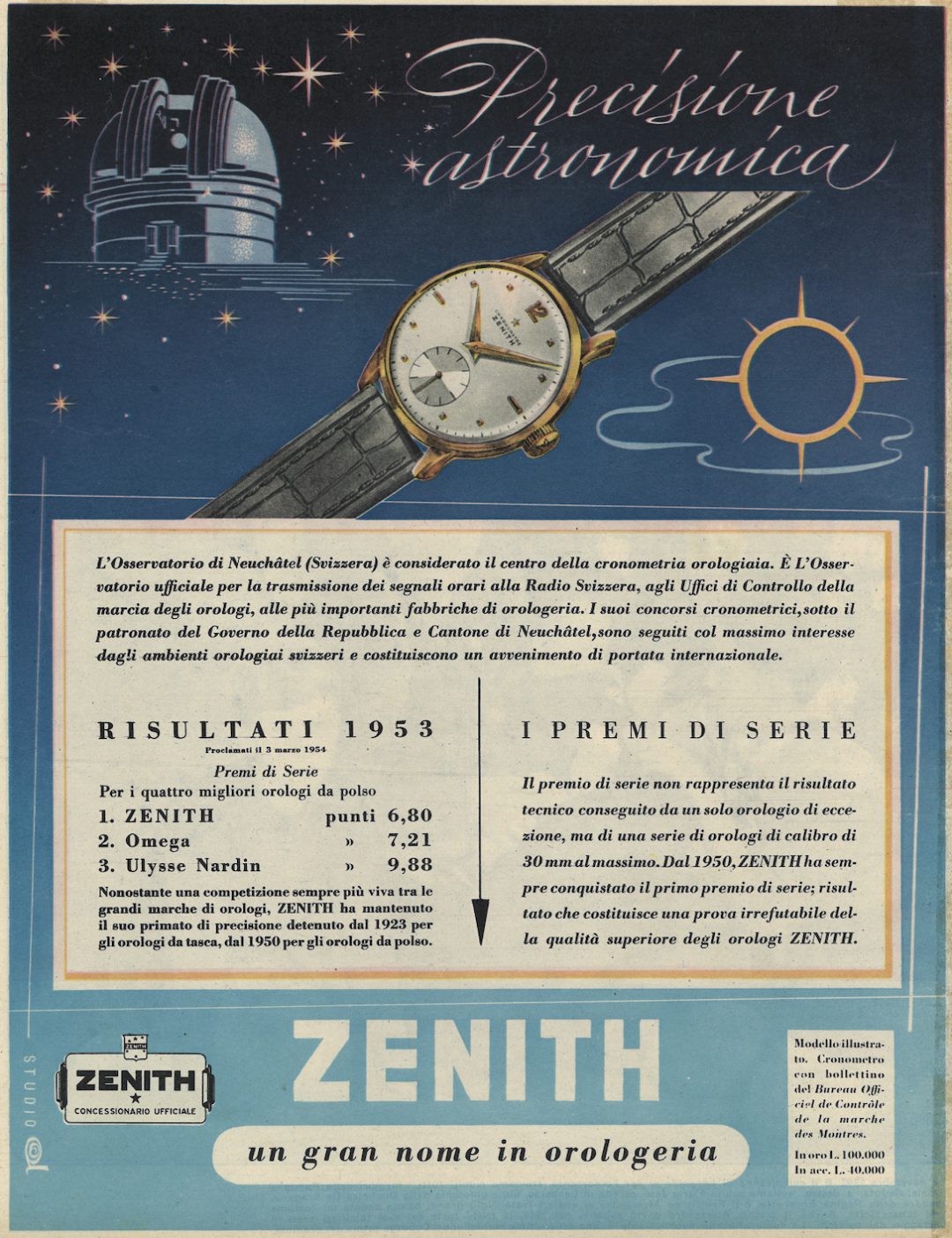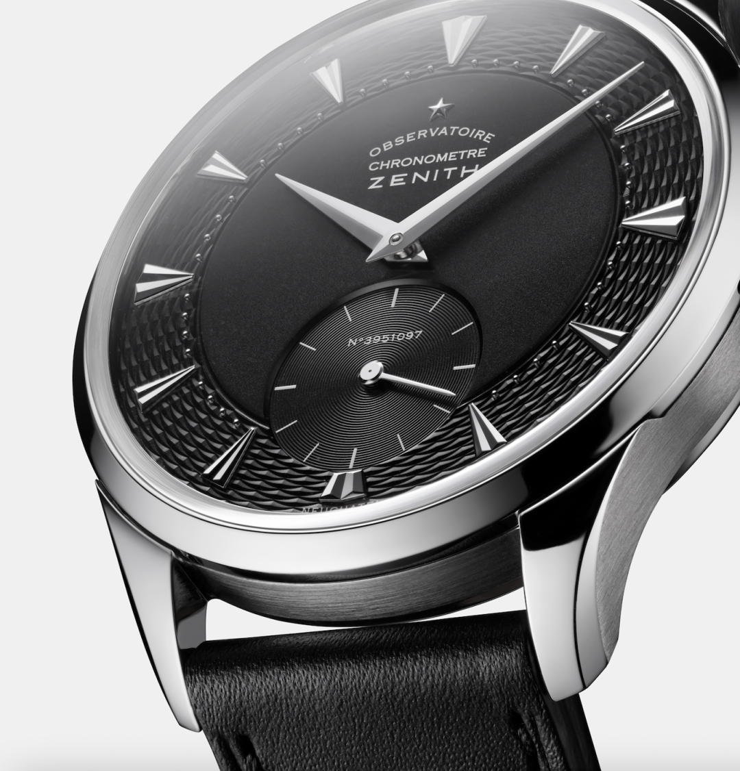 Для серии Calibre 135-O Observatoire были отобраны 10 механизмов, которые относятся к триумфальному периоду 1950-1954 годов. Новая модель объединяет особенности часов 50-х, знаковые элементы Zenith и современный стиль. Круглый платиновый 38-мм корпус продолжается креплениями сужающейся формы, накрытыми безелем, заводная головка с насечками украшена современным логотипом Zenith со звездой, а выпуклый черный циферблат из стерлингового серебра с гравированным в технике гильоше закрывает объемное сапфировое стекло.