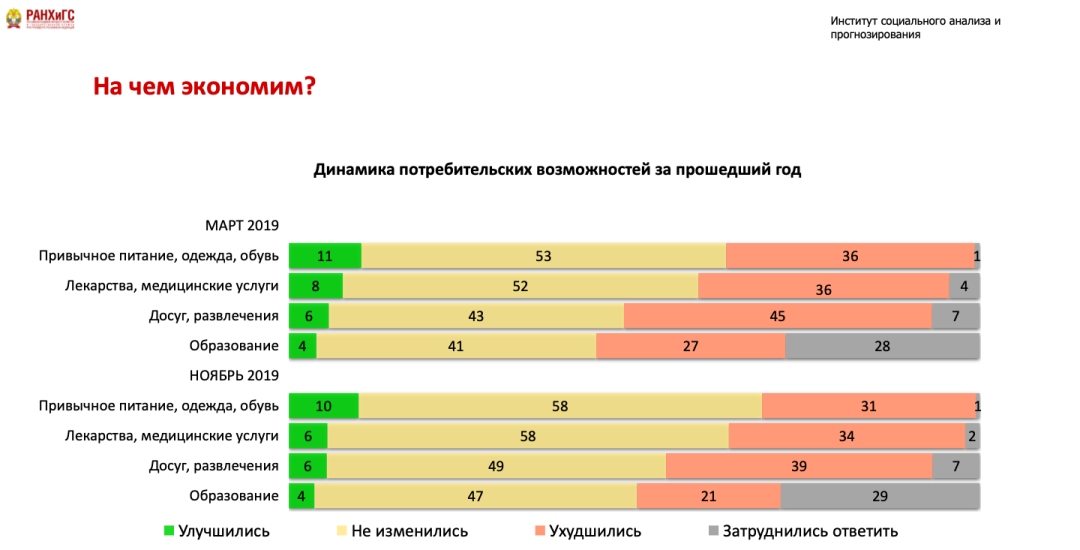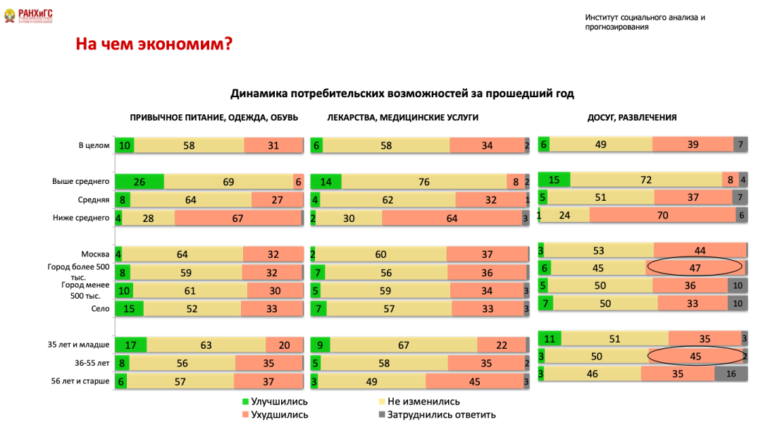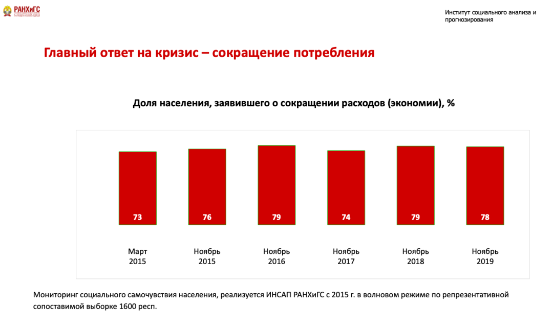 Мы будем иметь дело с многолетней моделью минимизации расходов и потребления, которая досталась нам в наследство от предыдущих периодов. Каждый год значительная доля людей была вынуждена сокращать свои расходы и отказываться от привычной модели потребления. Это результаты мониторинга, который мы, Российская академия народного хозяйства, ведем с 2015 года. Это происходит во всех социальных группах с точки зрения доходов, во всех населенных пунктах и практически во всех возрастах.
