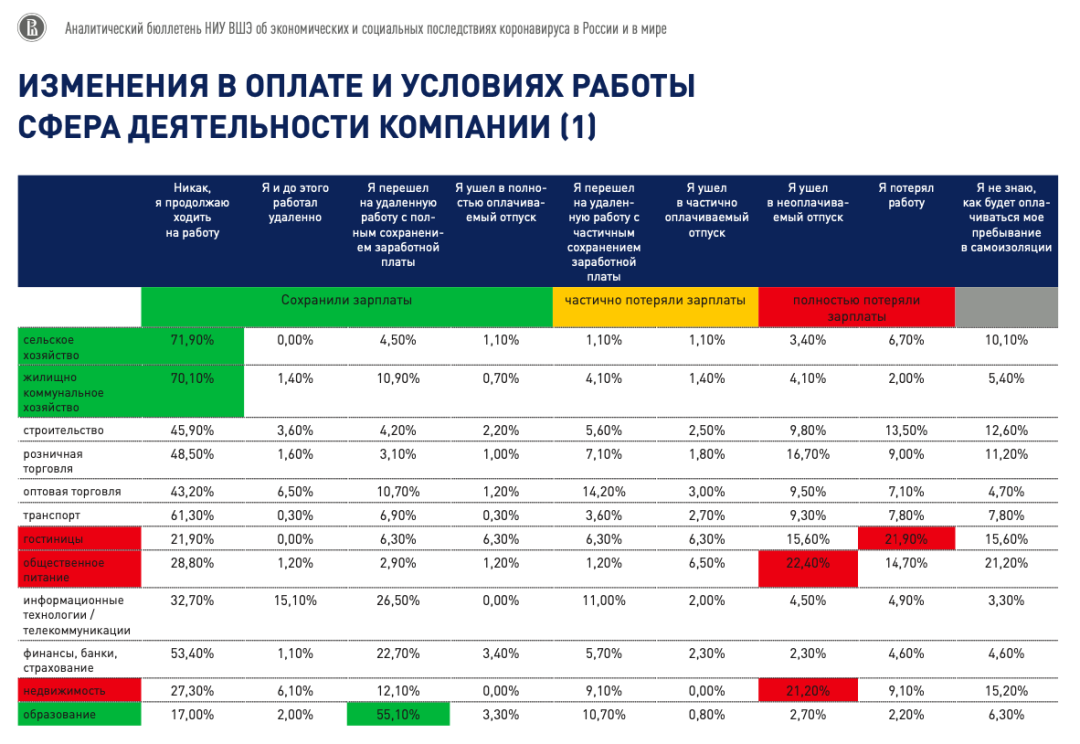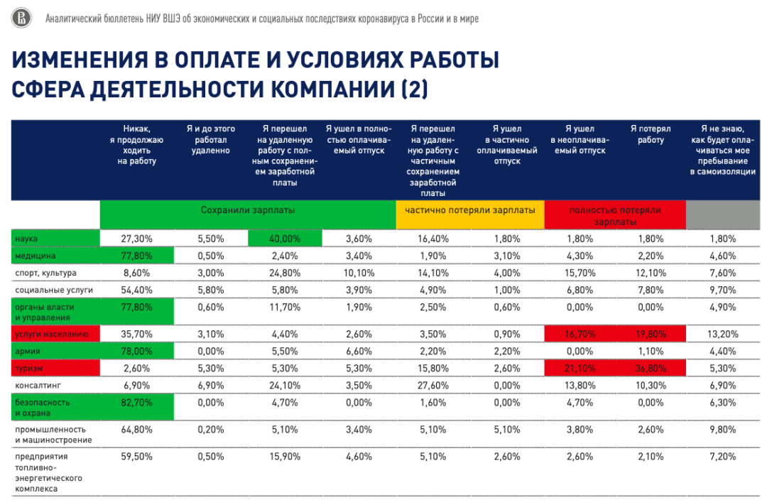 По данным нашего последнего опроса в разных отраслях от 10 до 45 % работающих заявляют о том, что они частично или полностью потеряли свою зарплату. Это без туризма, потому что там таковых три четверти, 76 %, почти 60 % потеряли все. Еще от 5 до 20% в зависимости от отрасли пока не знают, получат ли они деньги за этот период.