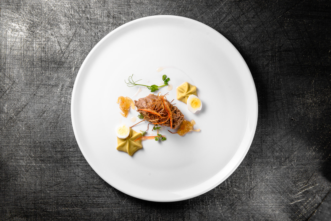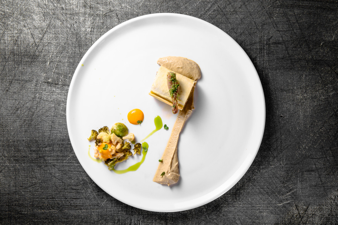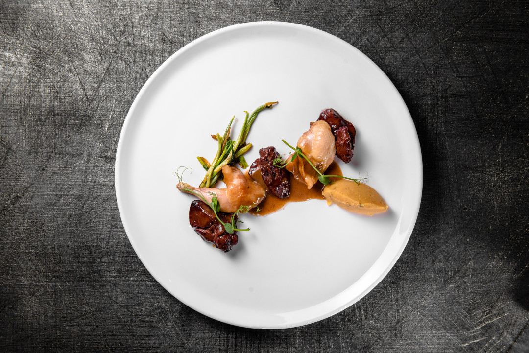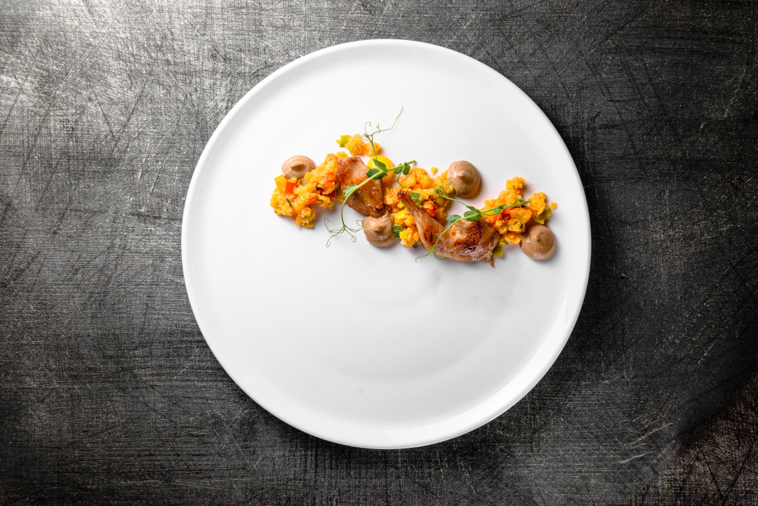 Горячее: Перепелиная грудка конфи, фаршированная апельсиновым конфитюром с соусом из цветной капусты и нотками цитруса, подается с овощным гратеном и кнелей из чечевицы и черемшой с вонтоном из цитрусов и куриной печени. Вино: Рислинг.