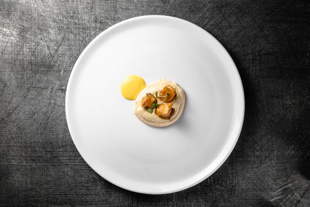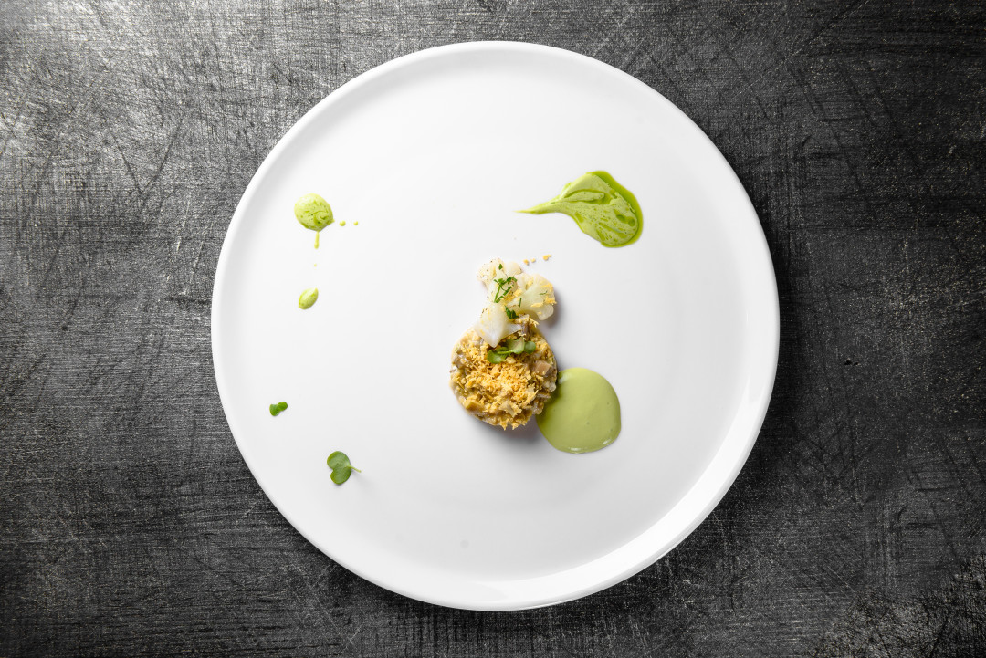Закуска: Закуска из томленого рапана в сливочном соусе с фенхелем, крошкой из хрустящего пармезана и соусом из брокколи, сельдереем и черемши с чипсой из цветной капусты. Вино: Шардоне.