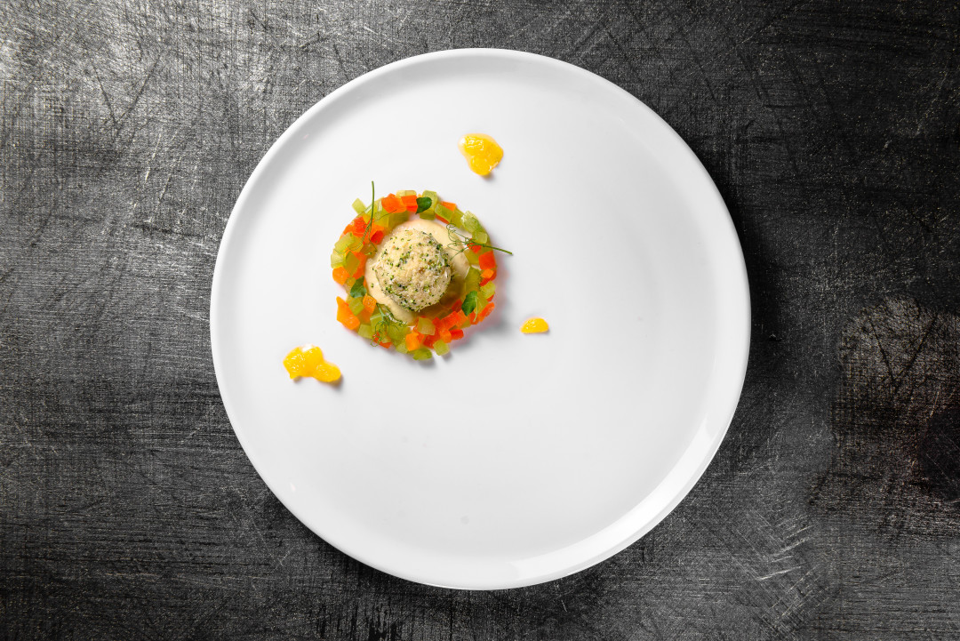Закуска: Пате из черноморского рапана, соусом из рапана и сливок в сопровождении компрессированных овощей и карамелизированным апельсином. Вино: Рислинг.