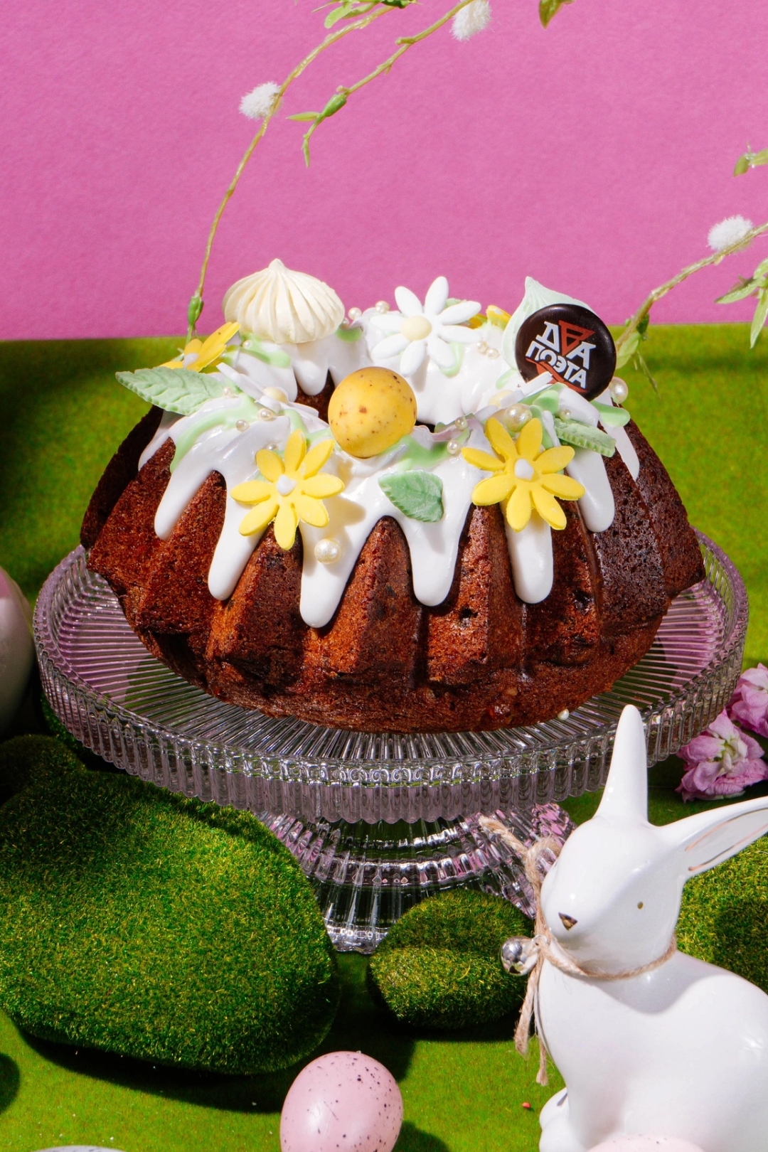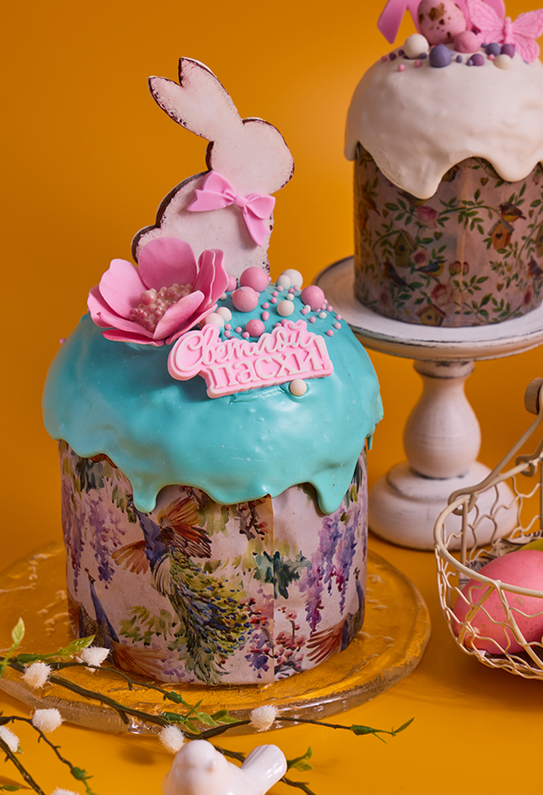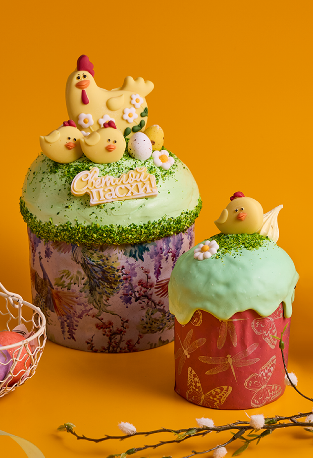 Кружевной мякиш дополнен изюмом, а украшение из безе, шоколадных цветов и тематических фигурок делают пасхальные изделия по-особенному волшебными. Так, в ассортименте представлены куличи, декорированные петушком, зайчиком, морковкой, храмом — с карамелью и шоколадной начинкой.