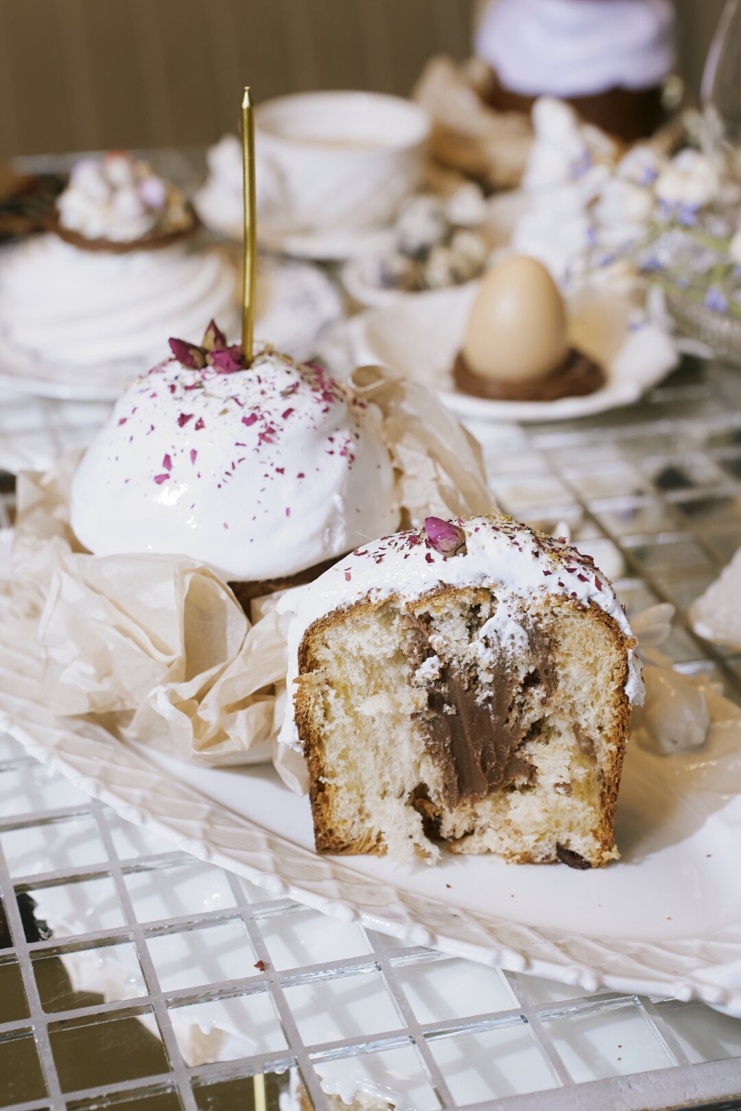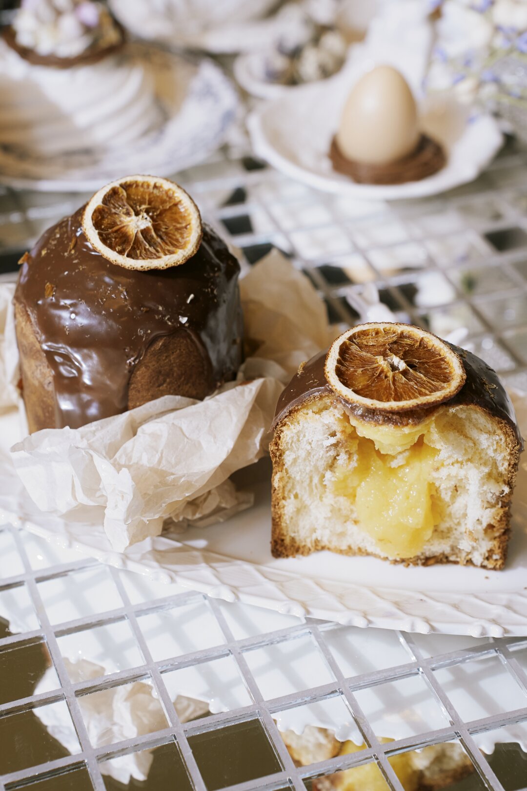 Начинаем с куличей. «Апельсиновый рассвет»: шоколадная глазурь с позолотой и сушеными цитрусами — апрельское небо за мгновение до рассвета, которое с каждом новым кусочком становится все яснее, и вот кульминация: из облаков воздушного теста появляется солнце — яркий и пряный апельсиновый курд. «Шоколадная ностальгия»: сочетание ганаша на молочном шоколаде, классической белковой помадки и розовых лепестков напоминает о лакомствах из детства и душевных семейных вечерах. «Сиреневый туман»: дымка из белковой помадки окутывает шоколадное гнездо на вершине холма из пористого теста, внутри скрывается сочная смородиновая начинка, добавляющая во вкус бодрящие нотки и делающая его сбалансированным.