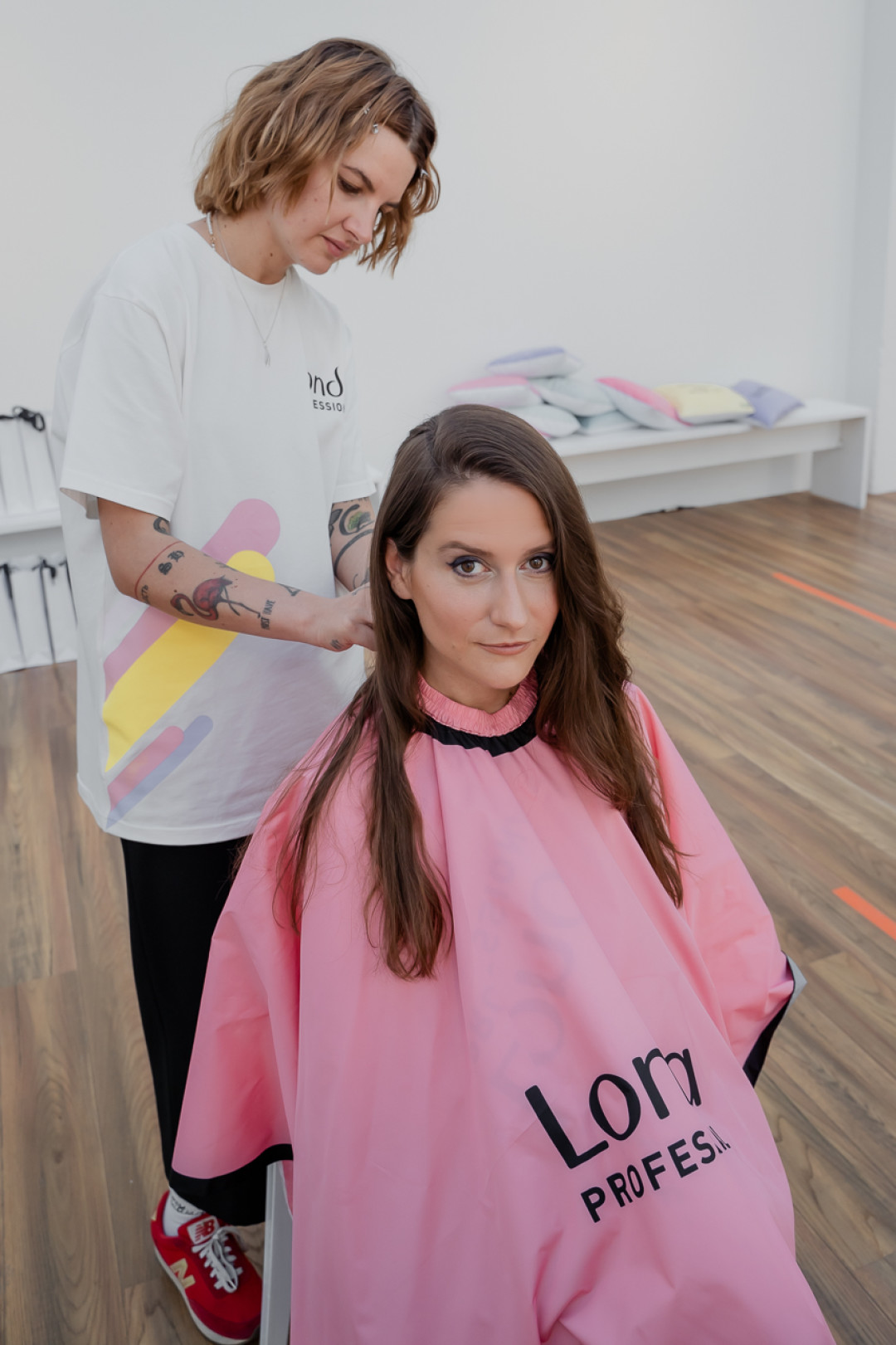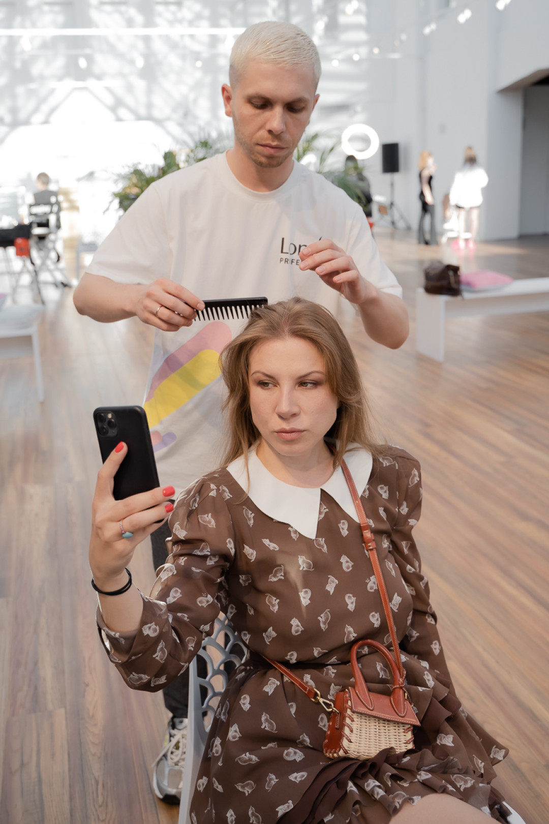 «Волосы, проработанные гелем, – абсолютный тренд 2021 года. Им можно убрать пряди от лица или подчеркнуть детали прически. А вместе с блестками он дает классный инфантильный вайб, и укладка превращается в чистое веселье без последствий (смывается гель элементарно). Люблю такие экспресс-преображения за атмосферу. У всех на девичнике был отличный настрой, ни малейшего снобизма и готовность к экспериментам».