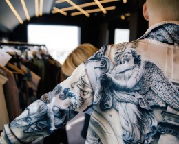 На свитшоты, плащи и юбки нанесены барельефы, скульптуры Атлантов и даже камеры видеонаблюдения с одного из самых красивых зданий императорского Петербурга.