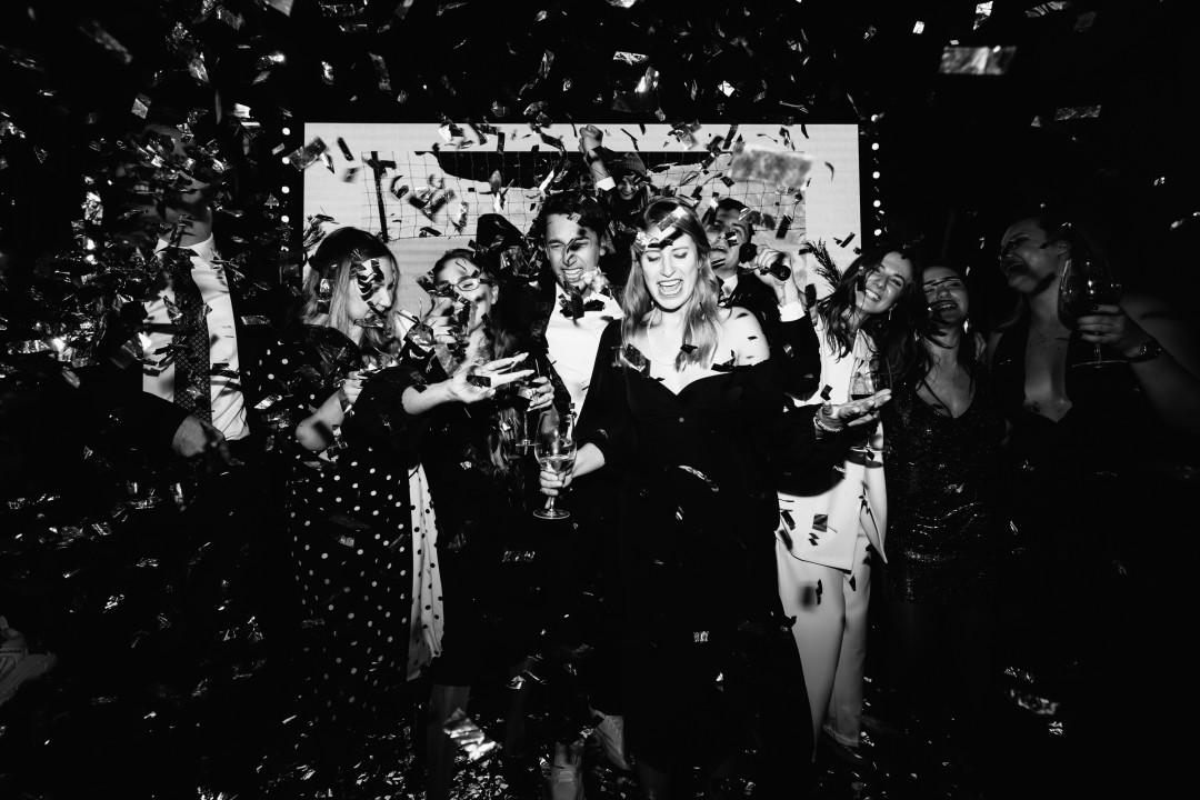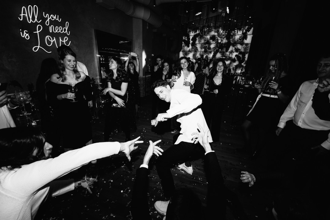 Музыканты Amelie Trio и Santa Barbara исполняли хитовые каверы на нестандартных инструментах: контрабас, флейта, укулеле. Саша танцевала с папой под What a Wonderful World Луи Армстронга, потом – в облаке конфетти и под аплодисменты была передана (в прямом смысле, прямо из рук в руки) Данилу. Для первого танца мы выбрали мелодичную версию Starman Дэвида Боуи. Дальше начался взрывной и ностальгический одновременно диджей-сет Алисы Шавровой (с Black Eyed Peas, Мадонной, Ветлицкой и Земфирой) — танцевали будто никто не видит, подпевали так, что утром проснулись охрипшими. Наш друг и ведущий Костя Катышев провёл праздник в максимально легкой и ненавязчивой манере. Мы всей своей программой напирали на то, что это не прям свадьба, а классная свадебная вечеринка — не нужно нас рассматривать и кричать «Горько», давайте уже чокаться и танцевать. И наслаждаться моментом!