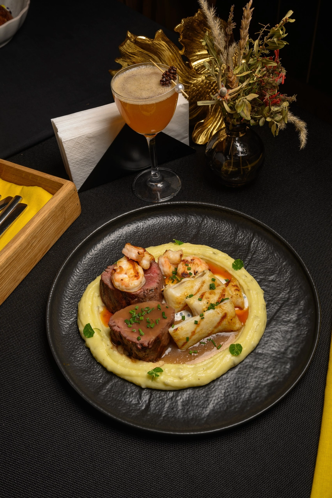 Концепция заведения основана на сочетании классических кулинарных традиций и современных тенденций гастрономии, что позволяет удовлетворить вкусы как любителей простых и понятных блюд, так и искушенных гурманов. А флагманское блюдо «Жёлтой лисицы» — Surf&Turf, где невероятным образом сочетаются нежнейшее филе телятины с морепродуктами и грибным соусом, станет ярким гастрономическим акцентом вашего стола.