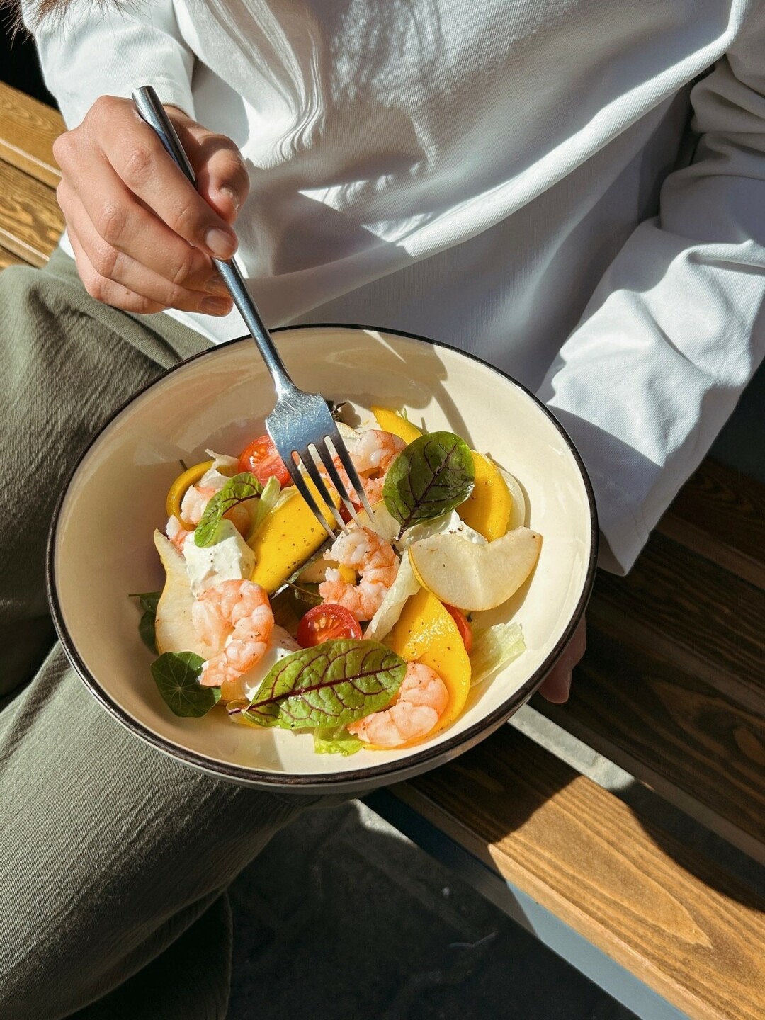 «Фрай» обновил не только пространство кофейни, но и меню. Вот так глобально по всем фронтам внесли в жизнь перемены. Добавили питательный скрембл с домашней индейкой, зеленью и яблочным соусом на завтрак, поке и салат с сезонным манго — на обед и ужин.