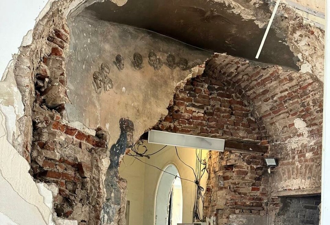 Межзаловые перегородки, установленные в центральном приделе в 20-е годы XX века, снесли. Местами снят верхний слой краски, под ним и увидели фрагменты. Сейчас здание готовят к реконструкции, исторический вид интерьера соборного храма намерены восстановить.