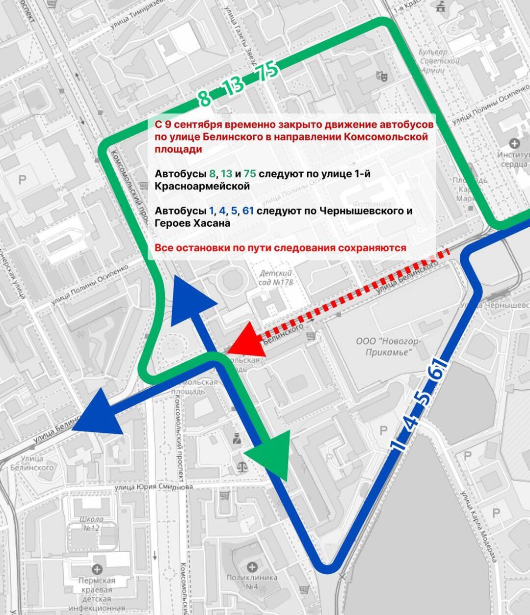 Как рассказали в пресс-службе администрации Перми, закрыт участок улицы Белинского от остановки «Площадь Карла Маркса» до Комсомольской площади. Автобусы №1, 4, 5 и 61 пойдут в объезд по улицам Чернышевского и Героев Хасана, №8, 13 и 75 перенаправят на улицу 1-й Красноармейская.
