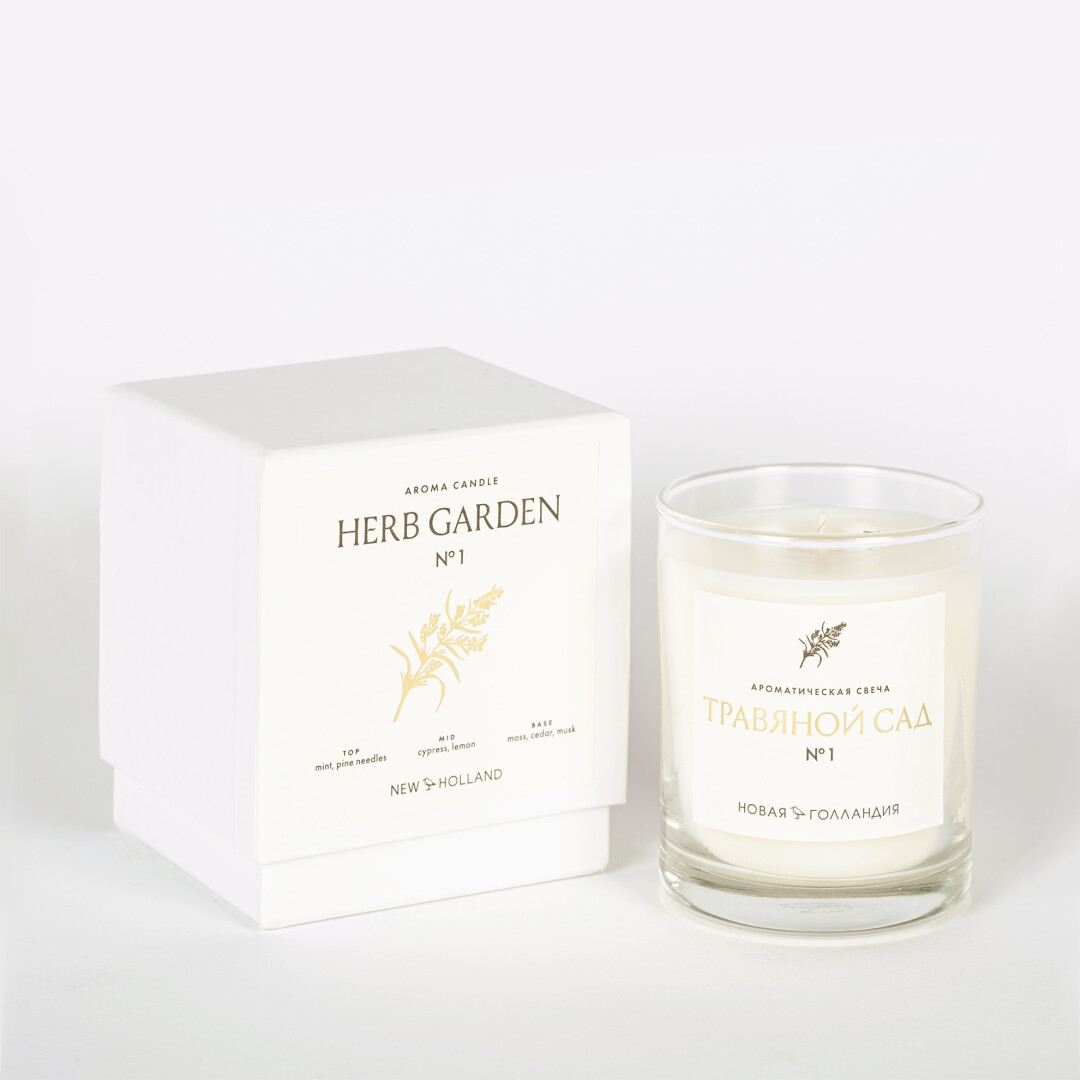 Свеча с ароматом травяного сада создана ограниченным тиражом как сувенирная продукция петербургского общественного пространства «Новая Голландия». Верхние ноты — сосновая хвоя и мята, средние — кипарис и лимон, а базовые — мох, кедр, мускус. Рассчитана на 50 часов горения, а после — стеклянный стакан можно очистить от остатков воска и использовать в качестве декора.
