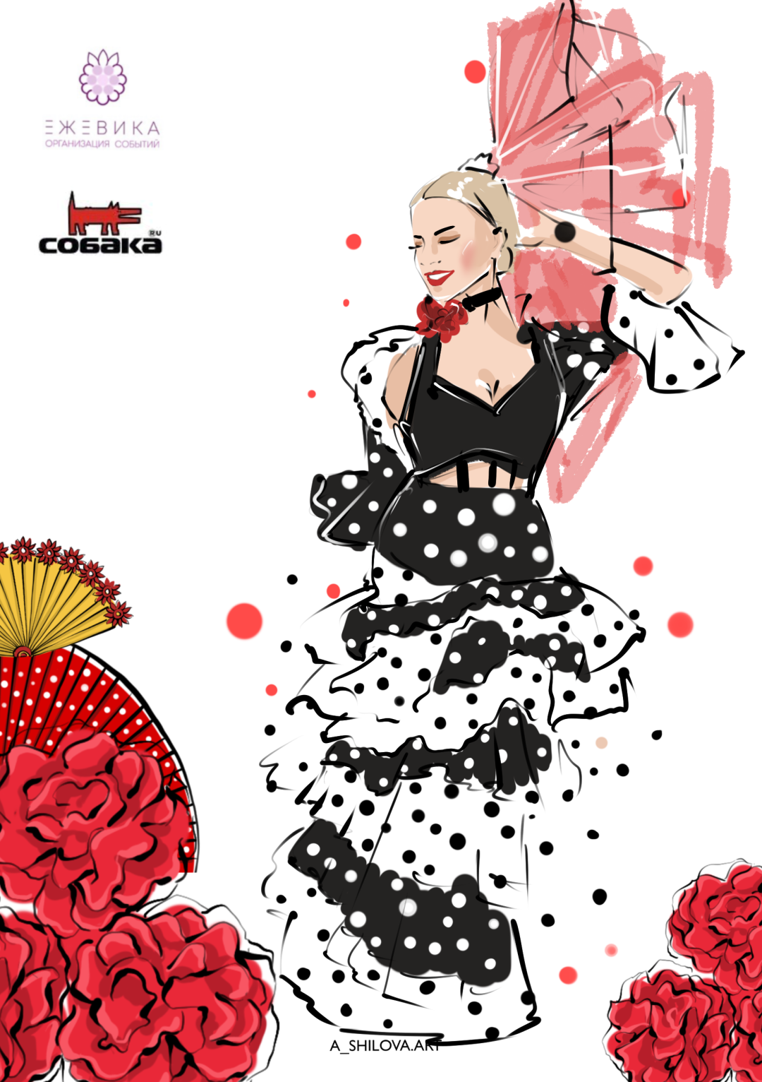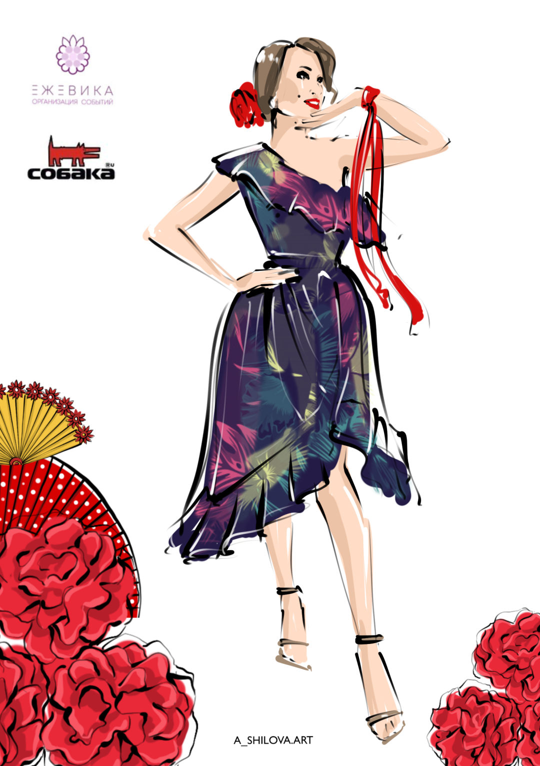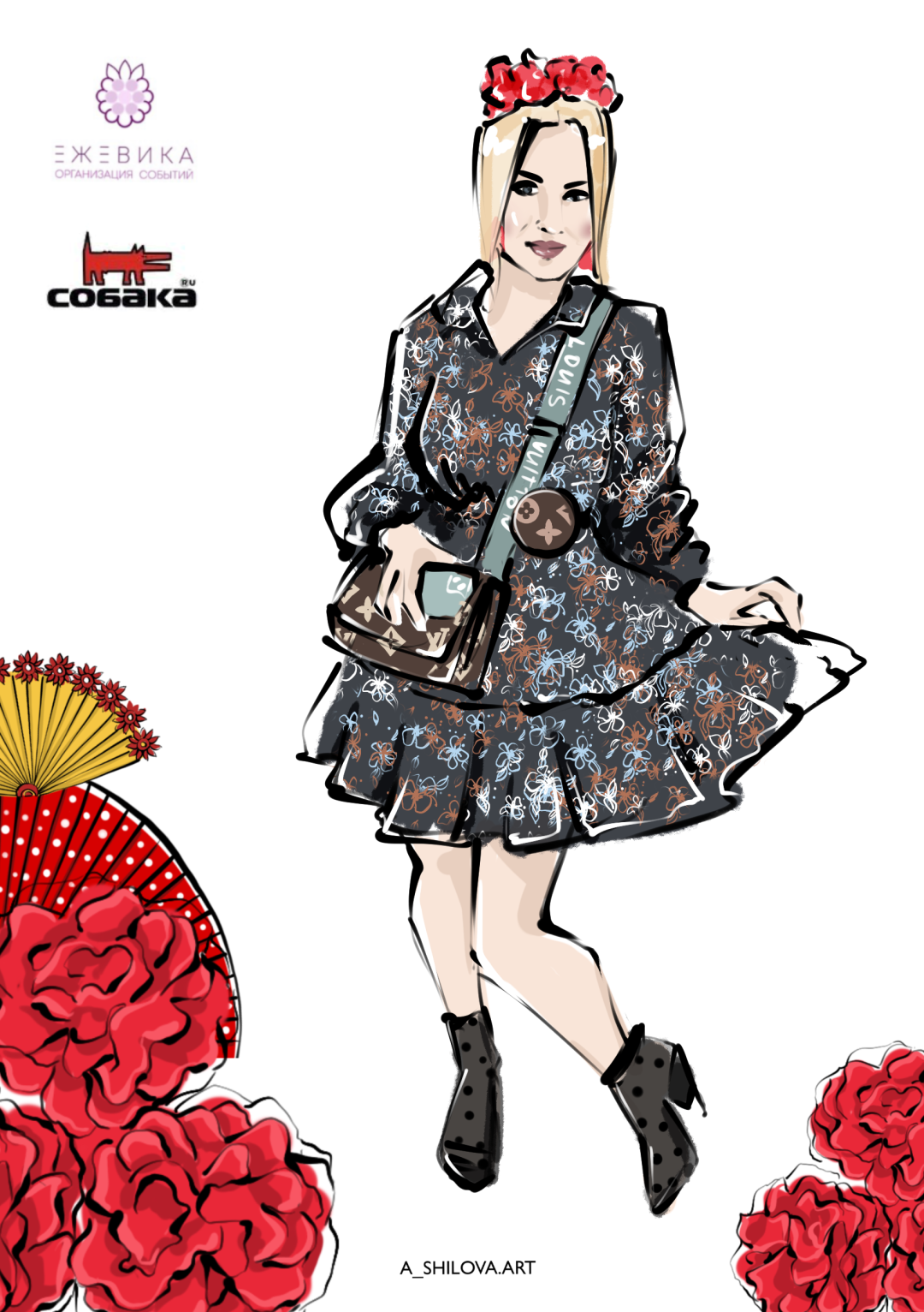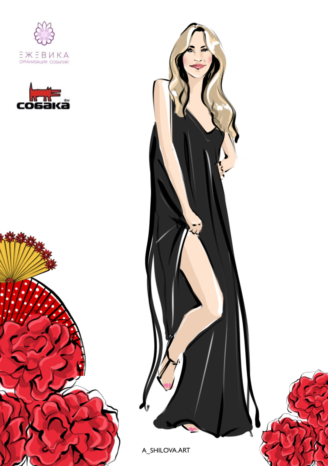 Я рисую в нескольких стилях: flat (плоская) иллюстрация и fashion – скетчи с большей реалистичностью. Перед мероприятием я показываю заказчику варианты стилизаций, и мы обговариваем формат иллюстраций.