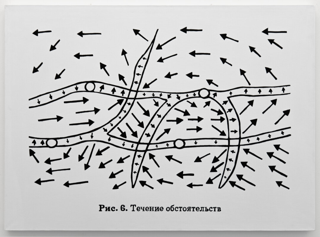 • «Течение обстоятельств» Владимира Абиха — рисунок 6 из графической серии, в которой художник берет за основу редуцированные учебные иллюстрации и добавляет к ним метафорические подписи. Так получилось минималистичное пособие — набор авторских советов о жизни и одновременно рефлексия о месте живописи и текста в современном искусстве. В серии — работы с отсылками к советской техлитературе, московскому концептуализму и интернет-мемам. Лот представлен по стартовой цене 250 тысяч рублей.