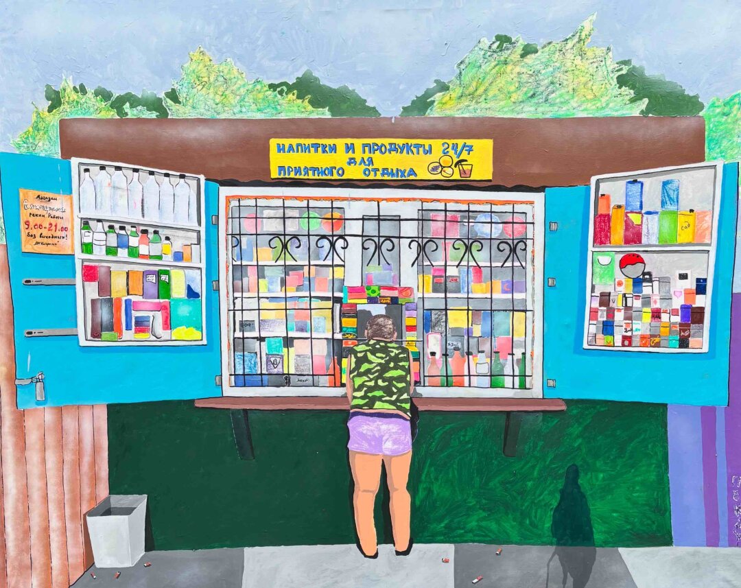 • «Ларек у дома» Влада Пожара — станковая картина 2025 года на классический для художника сюжет из повседневной жизни. Беря за основу тиражную советскую фотографию, художник изображает «осознанную простоту» и взывает к ощущению ностальгии. Лот продается по блиц-цене 200 тысяч рублей.