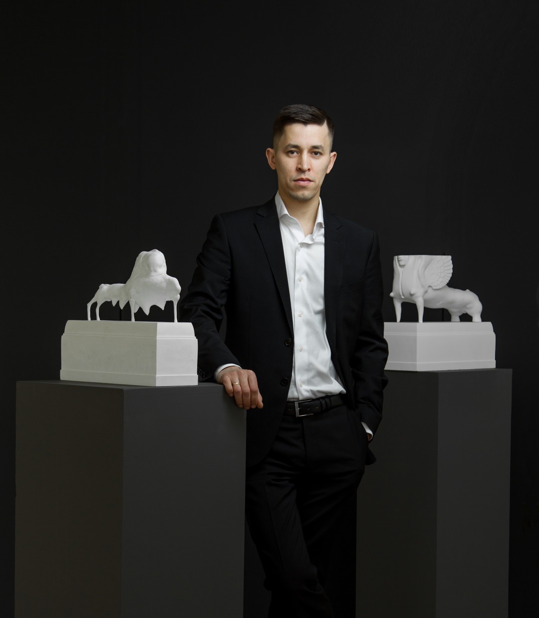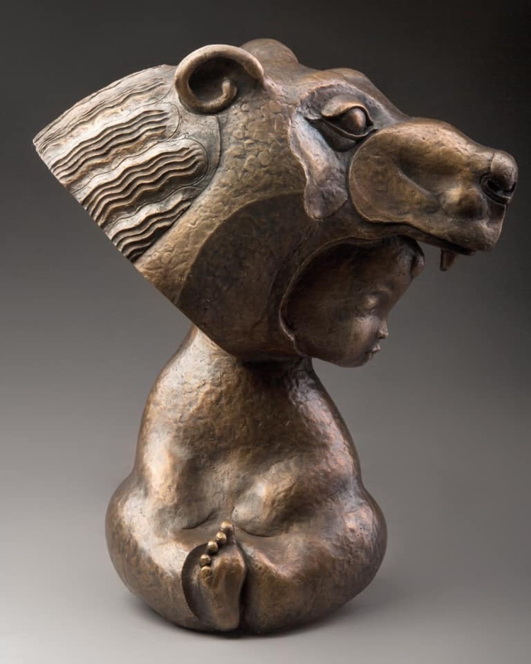 В последнее время это скульптура «Аю бала», изображающая младенца в большом шлеме в виде медведя, сам ребенок будто окутан панцирем брони. Слова в названии скульптуры «аю» и «бала» тюркские, означают – «медведь» и «ребенок». Эта работа – рассуждение на тему поколений. Я вырос в татарской семье. У нас по традиции родители, воспитывая сына, часто говорят ему на татарском языке: «Будь сильным, как медведь». Они сравнивают своего ребенка с сильным животным, наделяют его защитой и закладывают самые лучшие черты предков. Часто их произносят, когда ребенка успокаивают, гладят по голове или парят в бане, чтобы он не плакал, тем самым воспитывая его, прививая ему силу и терпение. Я с детства помню, как меня и братьев воспитывали этими словами. Мне было интересно запечатлеть это в скульптуре, одновременно отразить эту мысль в минимализме, современном контексте, шаманизме, этнике и символизме, мифологии, чтобы читался новый рассказ, чтобы он продолжался.