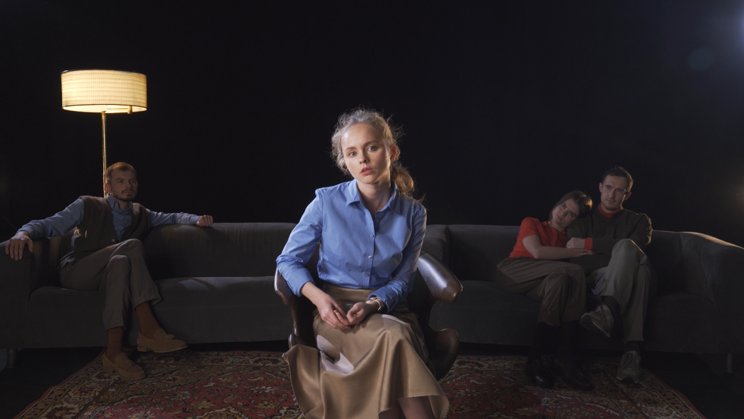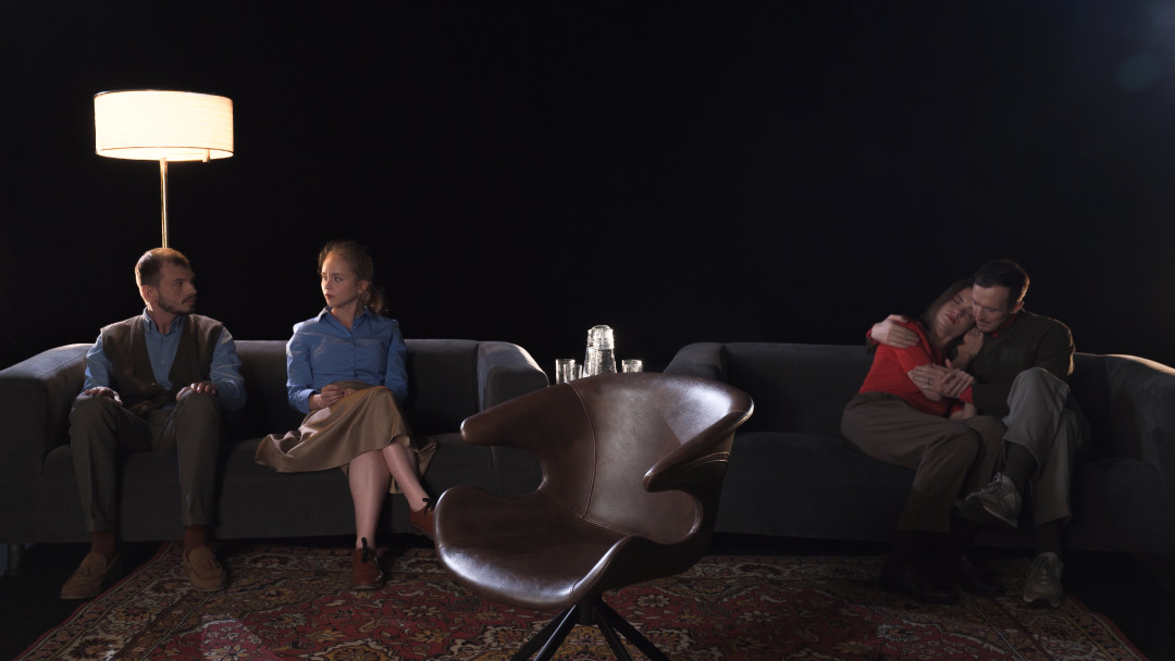 Николай Гостюхин поместил действие в пространство кабинета семейного психотерапевта. Именно сюда приходят эти две молодые семейные пары, чтобы затем рассказать о своих тревогах и переживаниях через отстраненный рассказ о жизни двух пожилых семейных пар. И только здесь в этом кабинете герои решаются на откровенный разговор и искренний контакт, которого все мы на долгое время оказались лишены из-за наступившей эпидемии COVID-19 и повсеместного использования онлайн-сервисов.