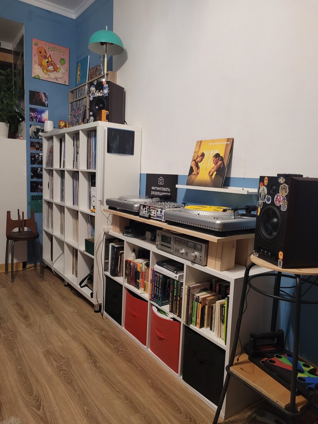 Я потихоньку начал подсаживать на винил друзей. В какой-то момент мы подумали: «Почему у нас пылятся пластинки и их слушаем только мы?». Так мы решили поиграть для друзей, даже договорились с «Тринашкой». Затем я купил хорошее оборудование: два проигрывателя и пульт. Со временем коллекционирование переросло в болезнь, когда «сливаешь» на винил все деньги. Теперь и жена слушает музыку на винил: я дарю ей пластинки.