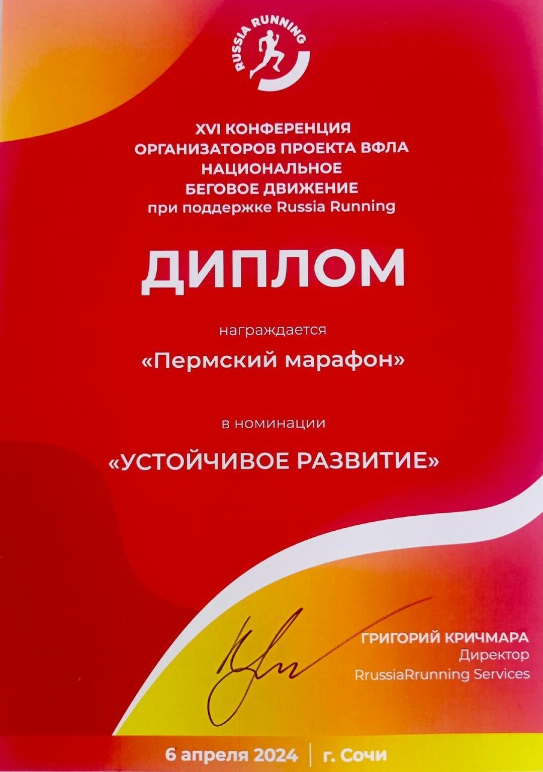 Платформа RussiaRunning отметила Пермский марафон дипломом в номинации «Устойчивое развитие». Награждение прошло в Сочи в рамках конференции организаторов проекта Всероссийской федерации легкой атлетики «Национальное беговое движение».