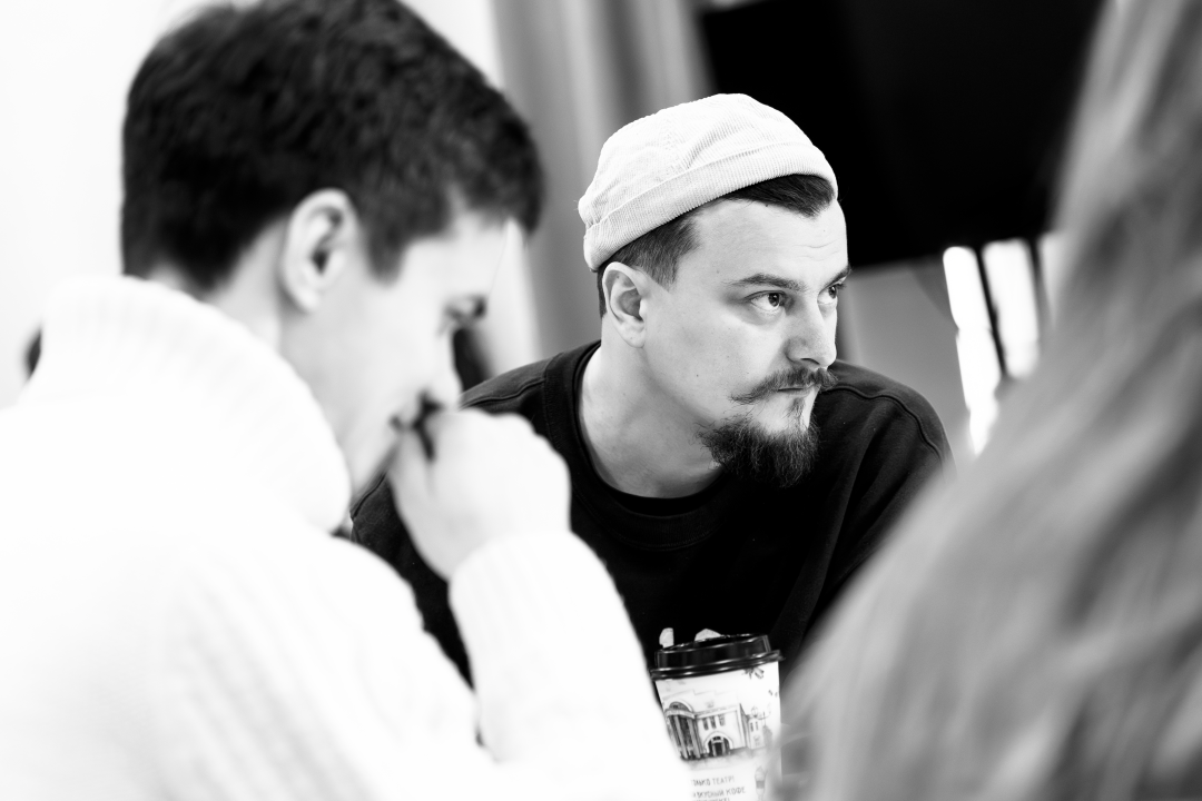 У Бориса Леонидовича я выпустил спектакль «Чайка. Эксперимент» (16+). Мне кажется, это была важная работа на «Сцене-Молот» и для меня, и для самого театра. Вся актерская команда на тот момент хотела прорваться и заявить о себе. Еще был, наверное, мой самый экспериментальный спектакль — «Пир во время чумы» (16+) в полной темноте. После этих постановок и цикла «Маленькие трагедии» я как-то быстро «перешел» к большим формам: случился «Раскольников» (18+), который стал определяющим спектаклем и открыл для меня пространство большой сцены. Именно с него начался мой настоящий вход в профессию режиссера.