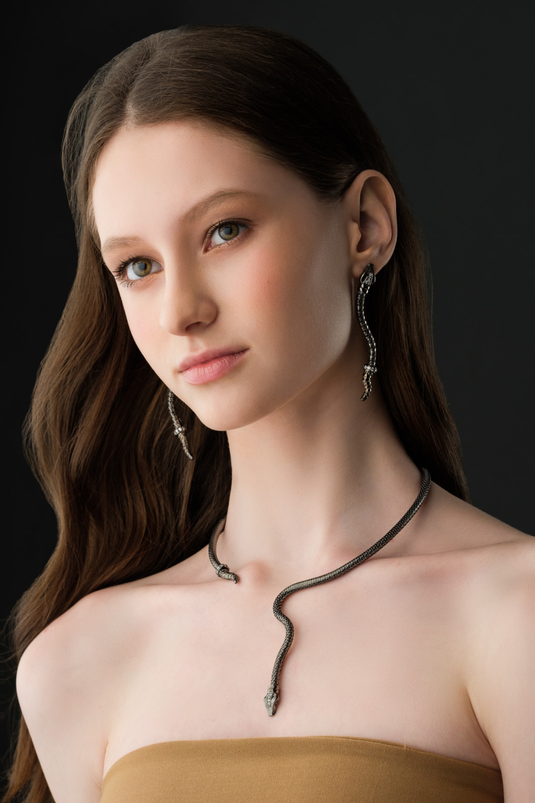 В этом сезоне для референсов аксессуарных коллекций диких змей выпустили из террариума. Приручаем драгоценных хладнокровных хищников, нося их в качестве ожерелья или сережек.