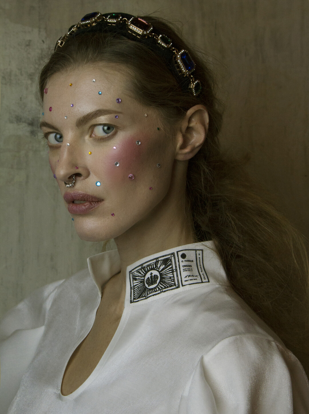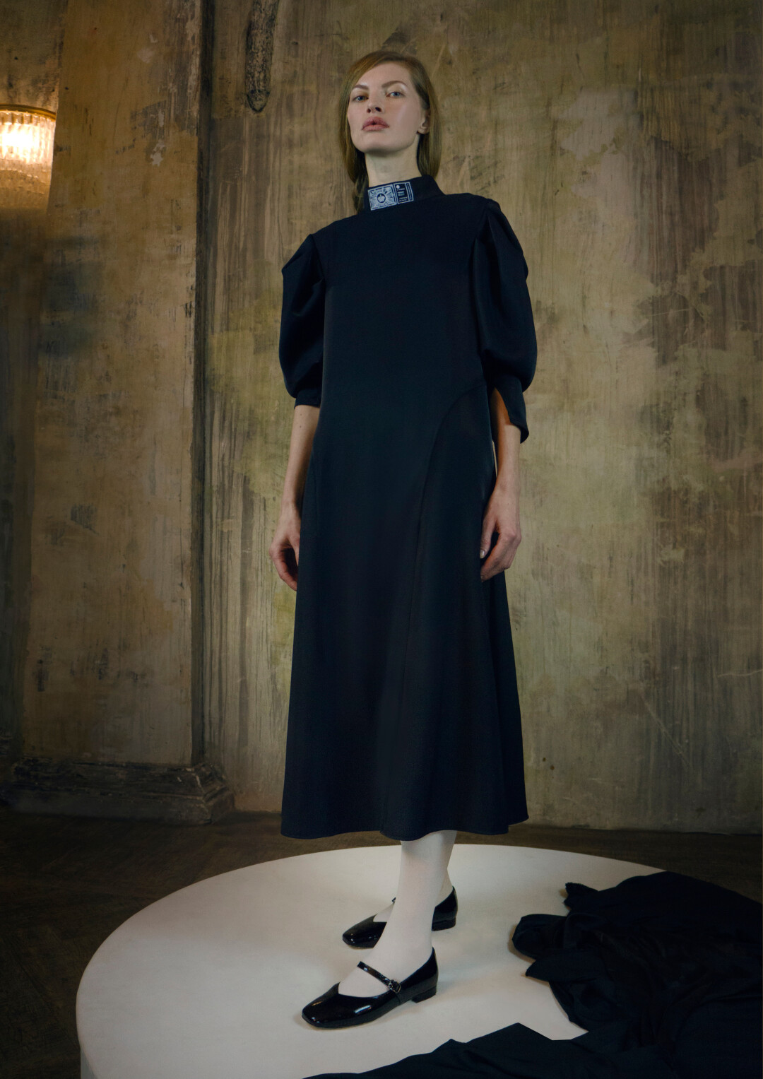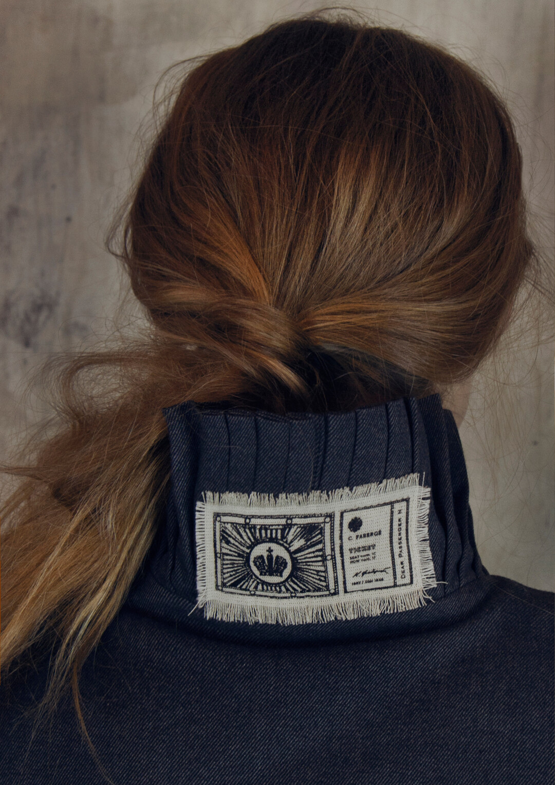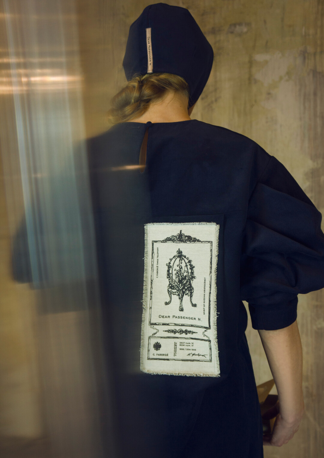 Воротник-стойка сконструирован так, чтобы подчеркивать лицо. Он закрывает шею сзади, затем плавно сходит на нет. На спинке воротника — «билет» со стилизованным изображением имперской короны. Графика вдохновлена акварелями Фаберже — его эскизам к будущим произведениям ювелирного искусства.