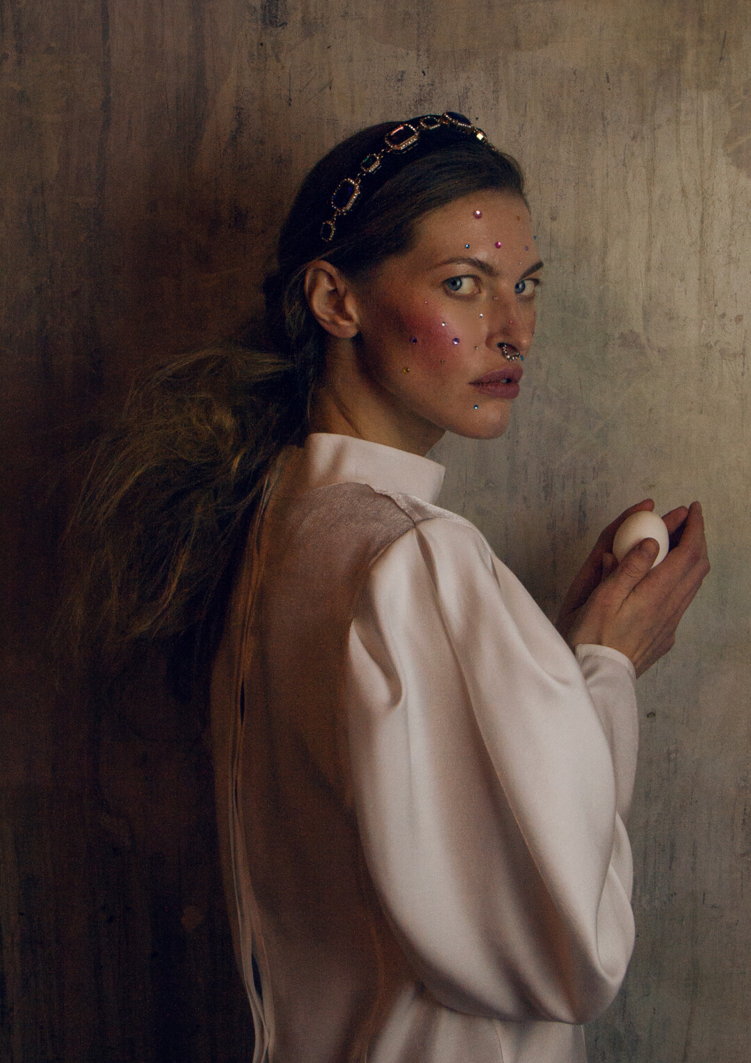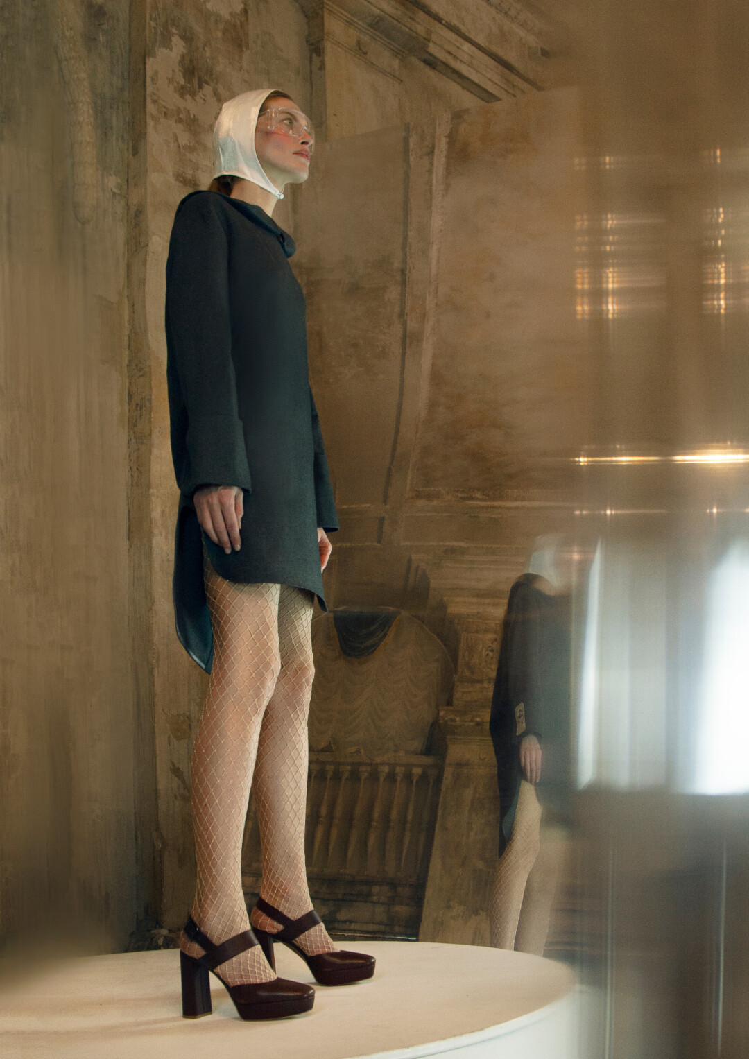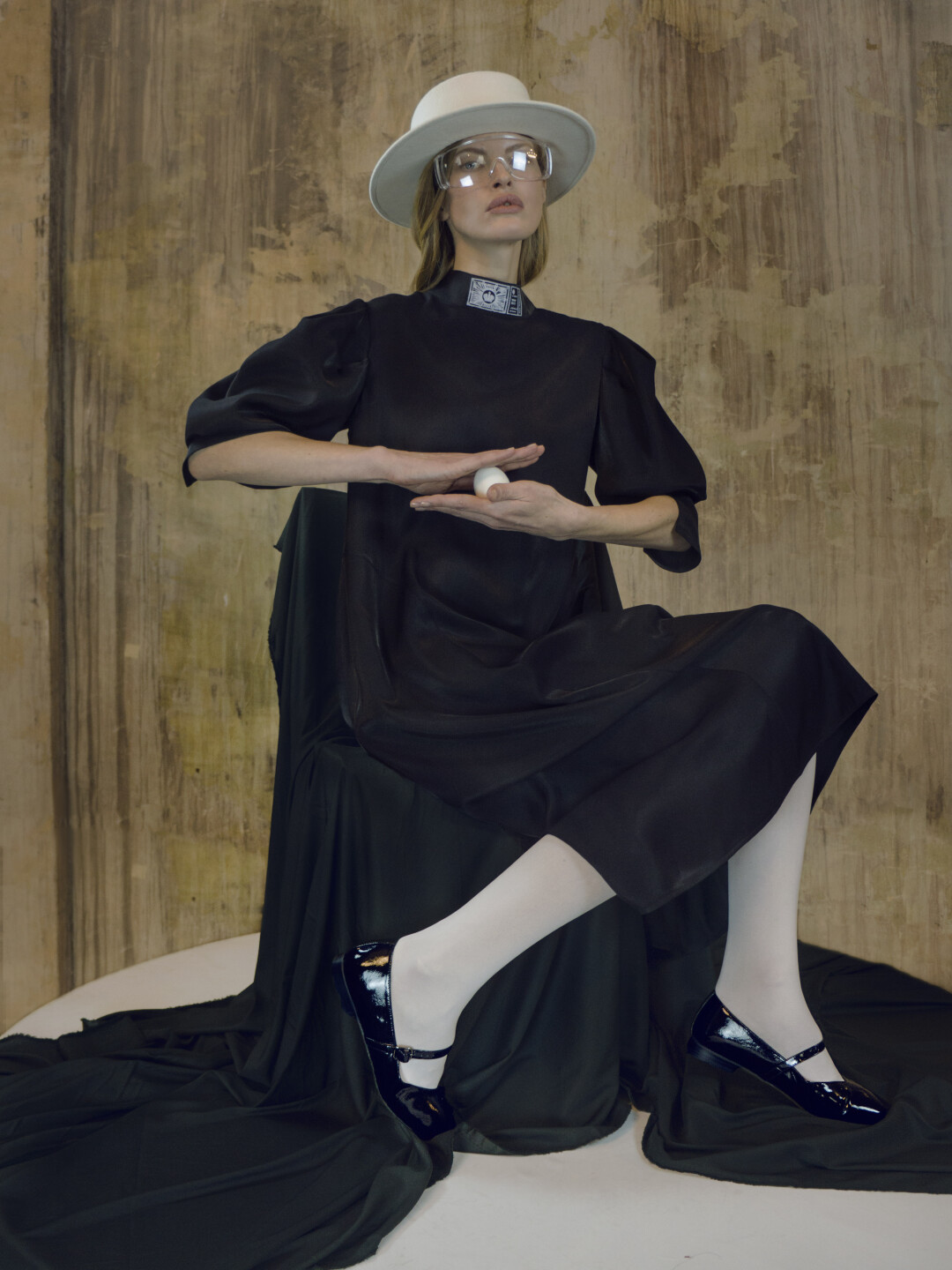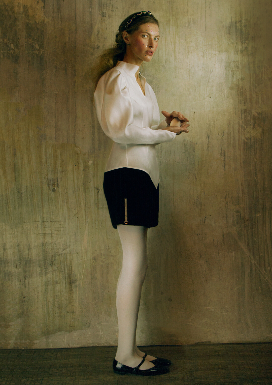 Воротник-стойка сконструирован так, чтобы подчеркивать лицо. Он закрывает шею сзади, затем плавно сходит на нет. На спинке воротника — «билет» со стилизованным изображением имперской короны. Графика вдохновлена акварелями Фаберже — его эскизам к будущим произведениям ювелирного искусства.