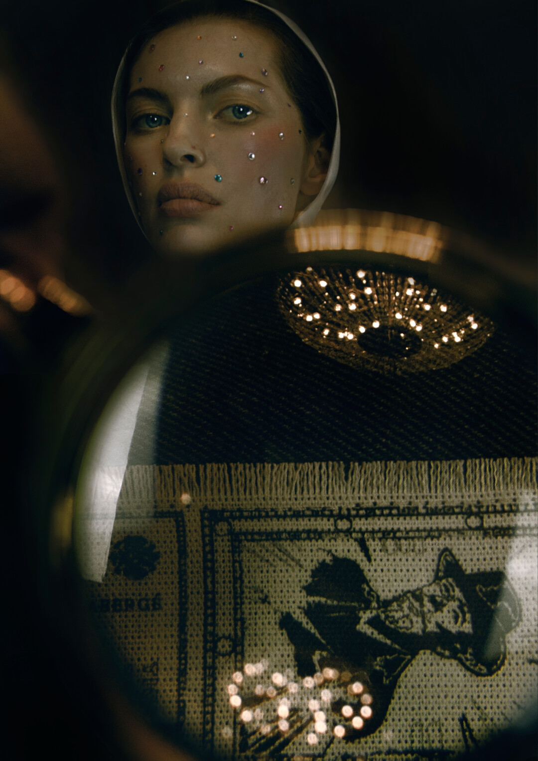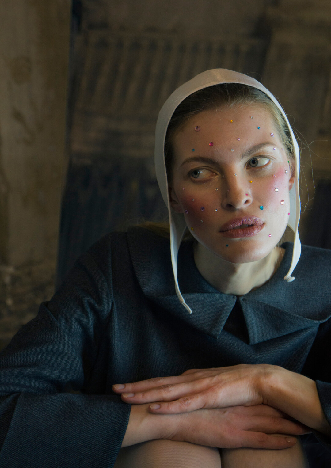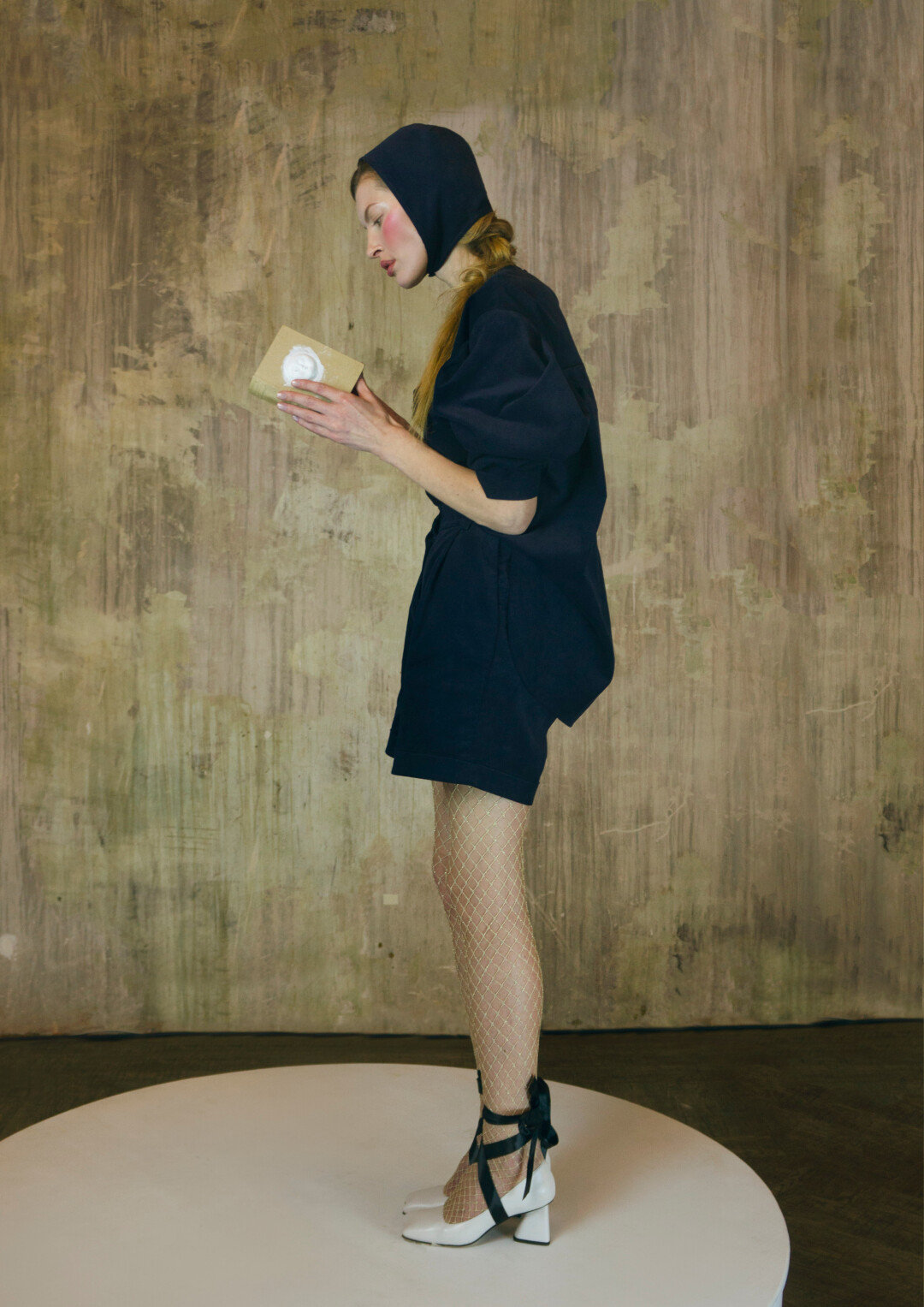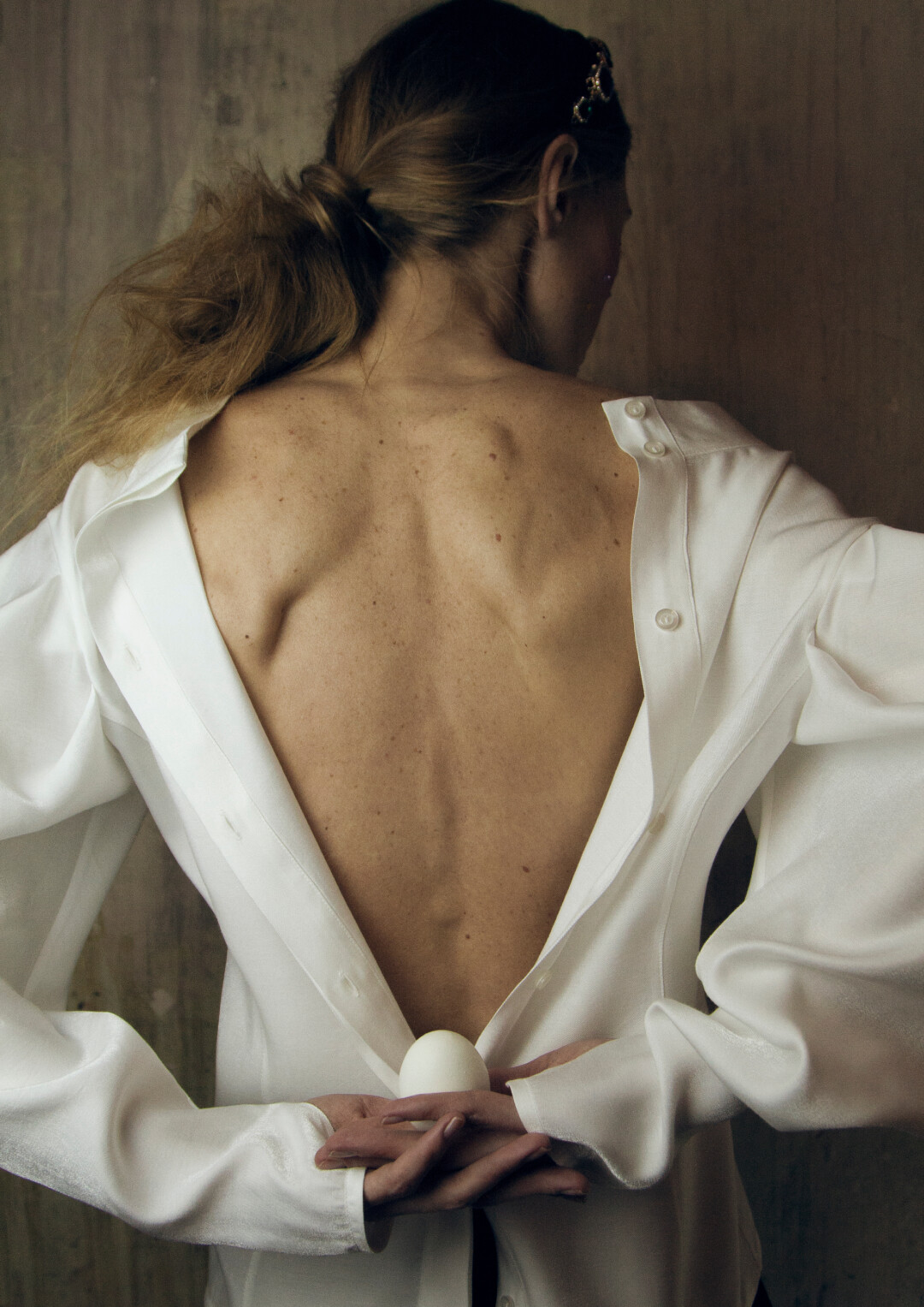 Воротник-стойка сконструирован так, чтобы подчеркивать лицо. Он закрывает шею сзади, затем плавно сходит на нет. На спинке воротника — «билет» со стилизованным изображением имперской короны. Графика вдохновлена акварелями Фаберже — его эскизам к будущим произведениям ювелирного искусства.