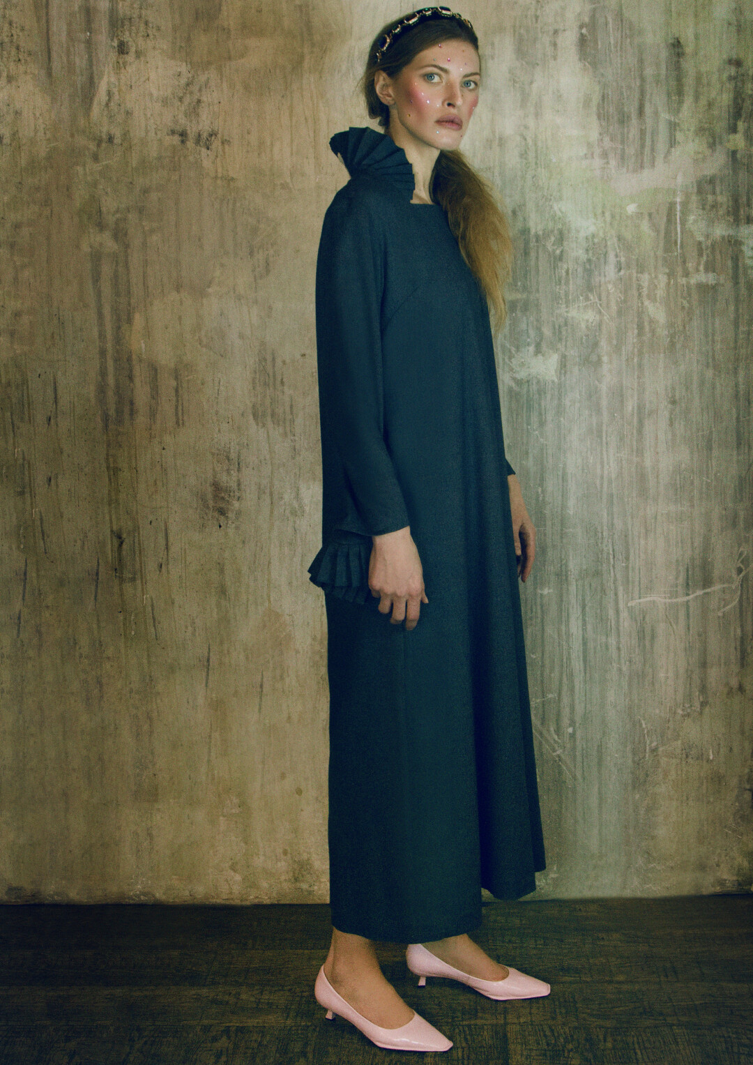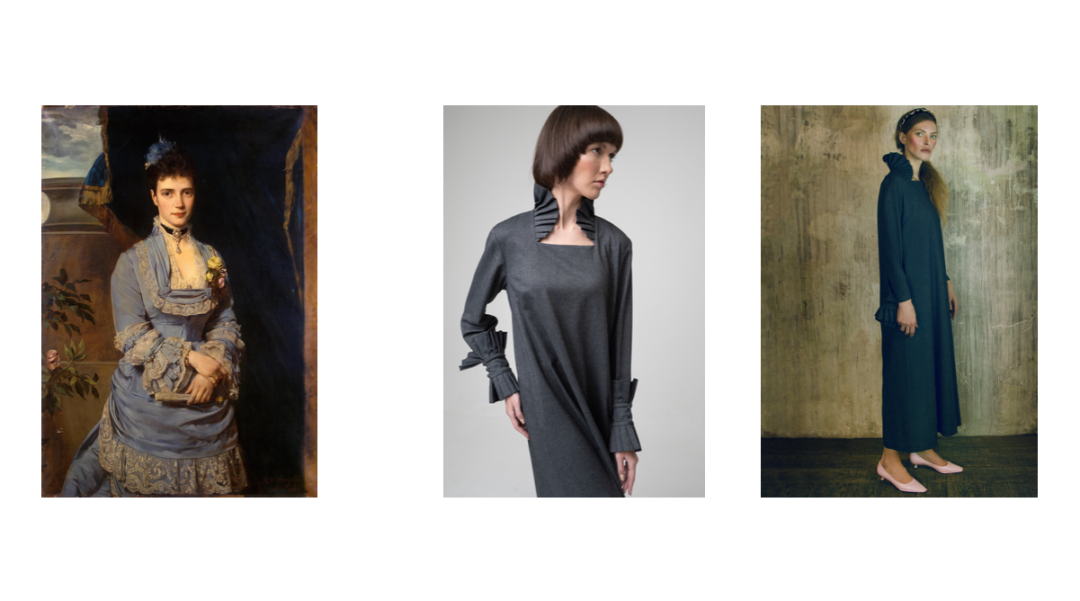 Платье создано вручную из плотного натурального немецкого хлопка. Оно украшено манжетами и воротником-стойкой — их плиссированная форма напоминает детали нарядов самой Марии Федоровны. Манжеты съемные, крепятся к рукавам на потайные пуговицы. Такая мобильность позволяет менять настроение образа по ситуации: без манжетов платье становится более повседневным, а с застегнутыми манжетами или же вальяжно подвешенными на рукавах оно обретает торжественность.